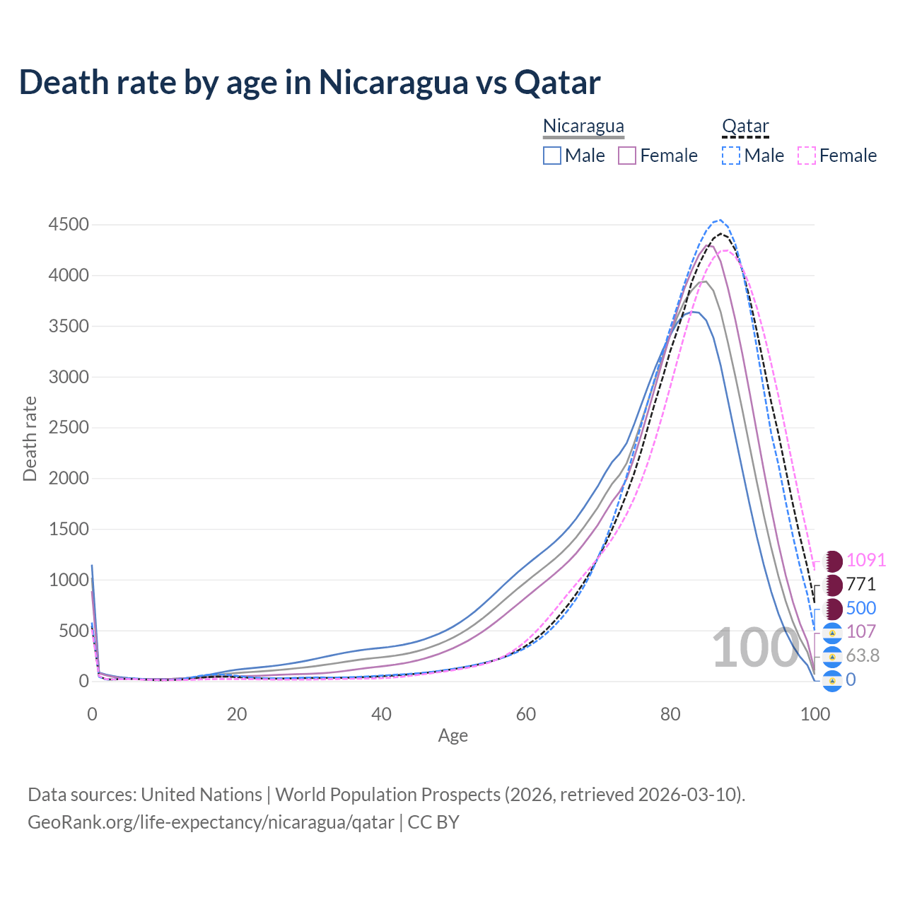 This life expectancy calculator shows the odds of living to 100, 95, 90, and below based on current age for both males and females in Nicaragua and Qatar, along with mean and median age of death. The calculations are based on the 2026 life tables (actuarial tables) from the UN World Population Prospects.