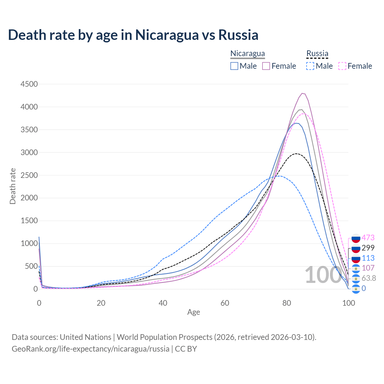 The average life expectancy at birth is 75.4 years in Nicaragua vs 73.7 in Russia. Nicaragua is ranked 91/197 by life expectancy, and Russia is 107/197. In Nicaragua, the life expectancy is 72.8 years for males and 77.9 years for females. In Russia, it's 67.9 years for males and 79.5 years for females.