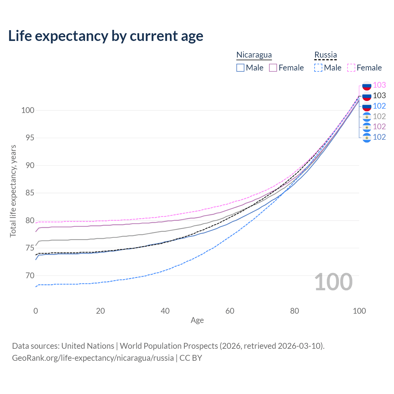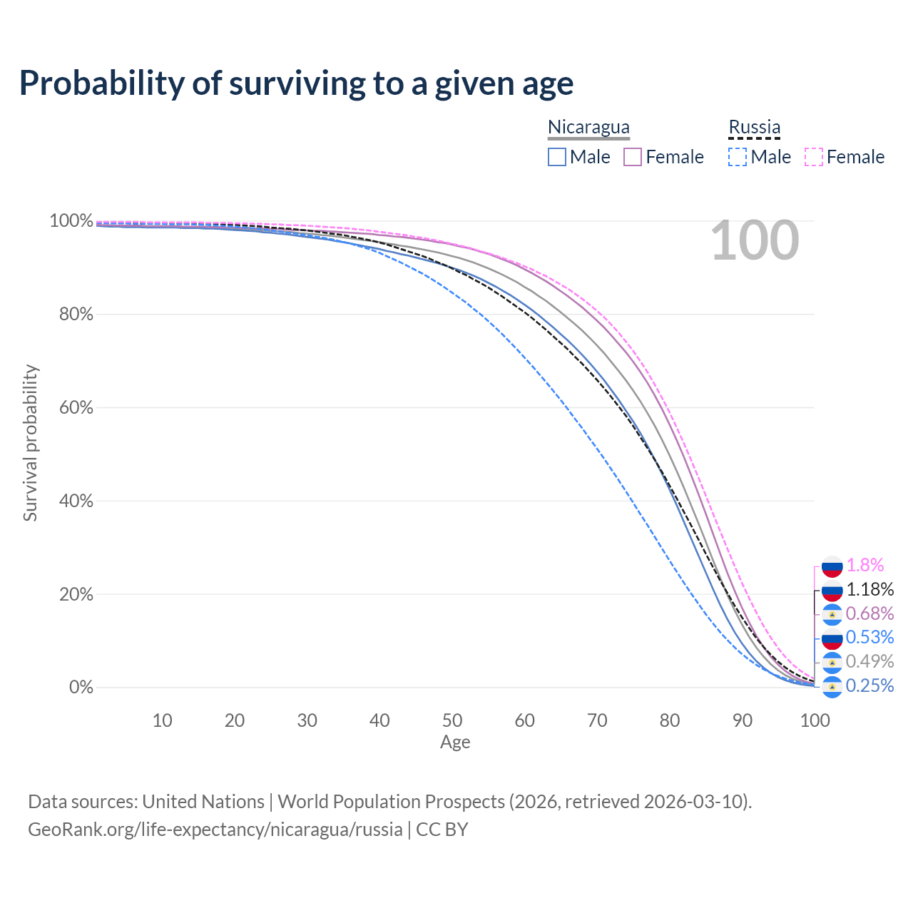 This life expectancy calculator shows the odds of living to 100, 95, 90, and below based on current age for both males and females in Nicaragua and Russia, along with mean and median age of death. The calculations are based on the 2026 life tables (actuarial tables) from the UN World Population Prospects.