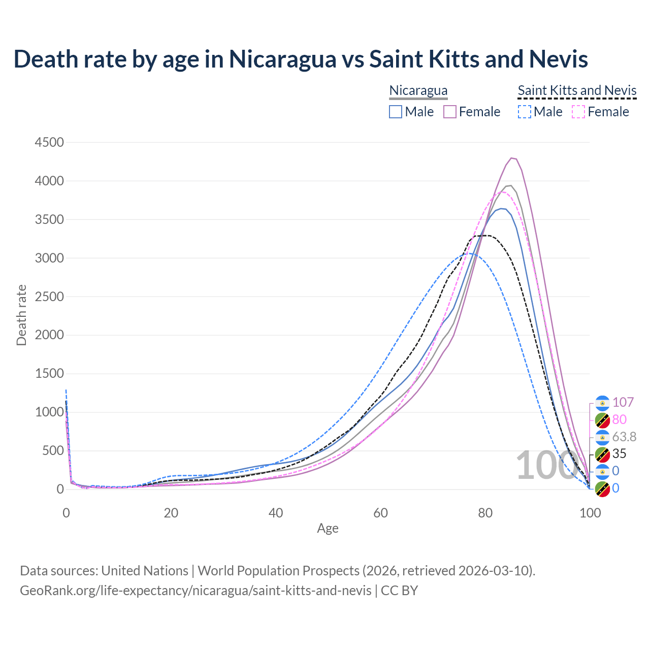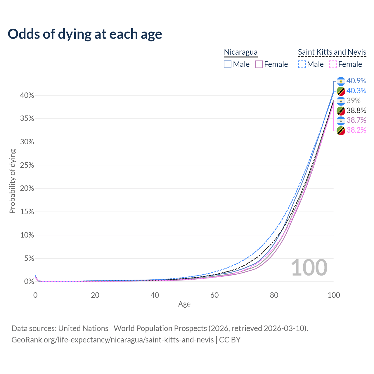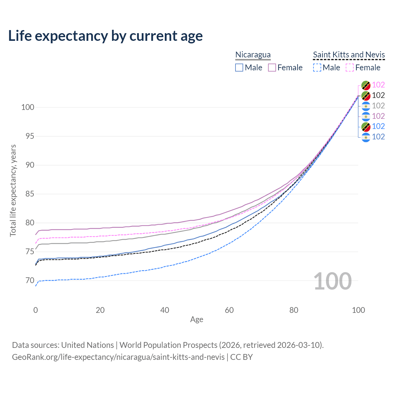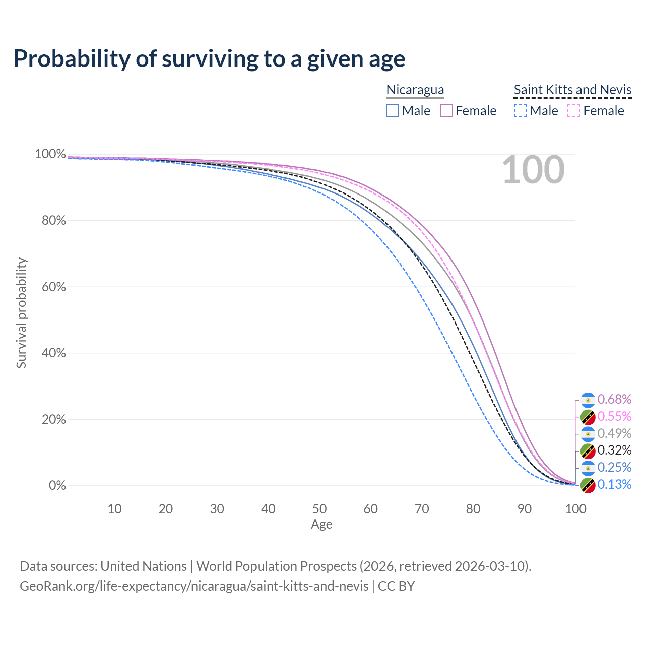 This life expectancy calculator shows the odds of living to 100, 95, 90, and below based on current age for both males and females in Nicaragua and Saint Kitts and Nevis, along with mean and median age of death. The calculations are based on the 2026 life tables (actuarial tables) from the UN World Population Prospects.