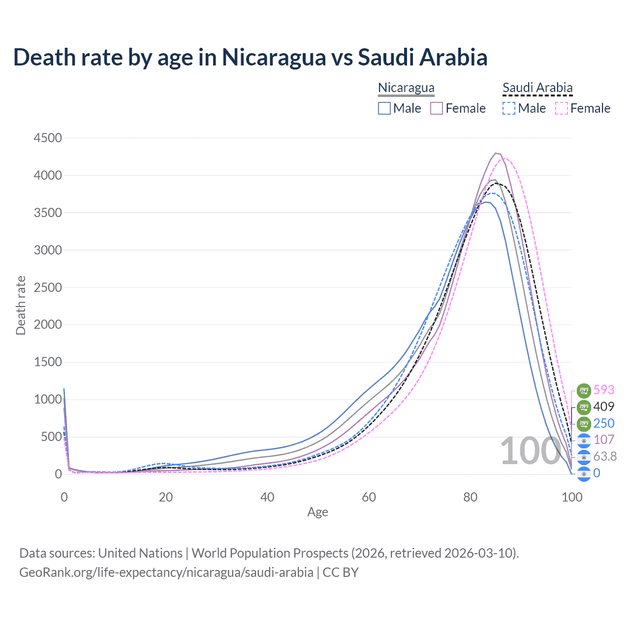 In Nicaragua, the most common age of death is 85, compared to 85 in Saudi Arabia. The median age of death is 79.9 in Nicaragua and 82.5 in Saudi Arabia, meaning only half of each cohort is expected to live past that age.