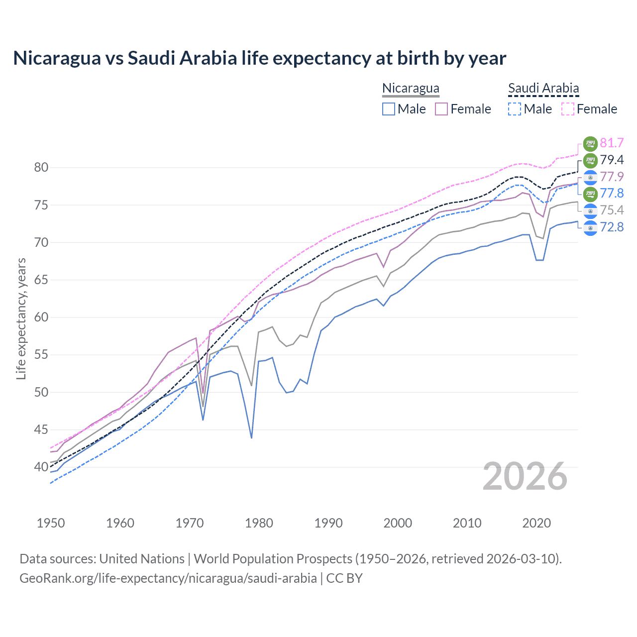 The average life expectancy at birth is 75.4 years in Nicaragua vs 79.4 in Saudi Arabia. Nicaragua is ranked 91/197 by life expectancy, and Saudi Arabia is 49/197. In Nicaragua, the life expectancy is 72.8 years for males and 77.9 years for females. In Saudi Arabia, it's 77.8 years for males and 81.7 years for females.