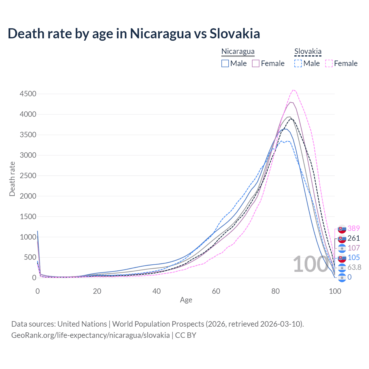 In Nicaragua, the most common age of death is 85, compared to 85 in Slovakia. The median age of death is 79.9 in Nicaragua and 82 in Slovakia, meaning only half of each cohort is expected to live past that age.