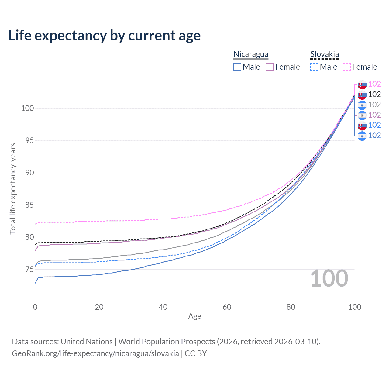 The average life expectancy at birth is 75.4 years in Nicaragua vs 78.8 in Slovakia. Nicaragua is ranked 91/197 by life expectancy, and Slovakia is 53/197. In Nicaragua, the life expectancy is 72.8 years for males and 77.9 years for females. In Slovakia, it's 75.6 years for males and 82 years for females.
