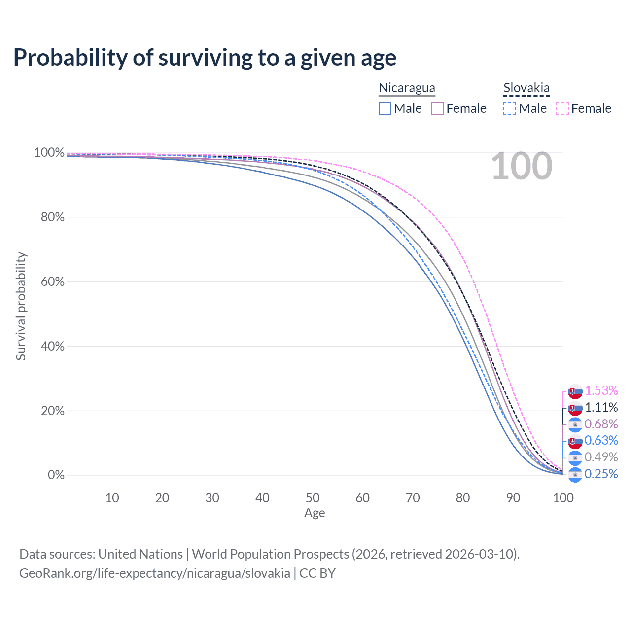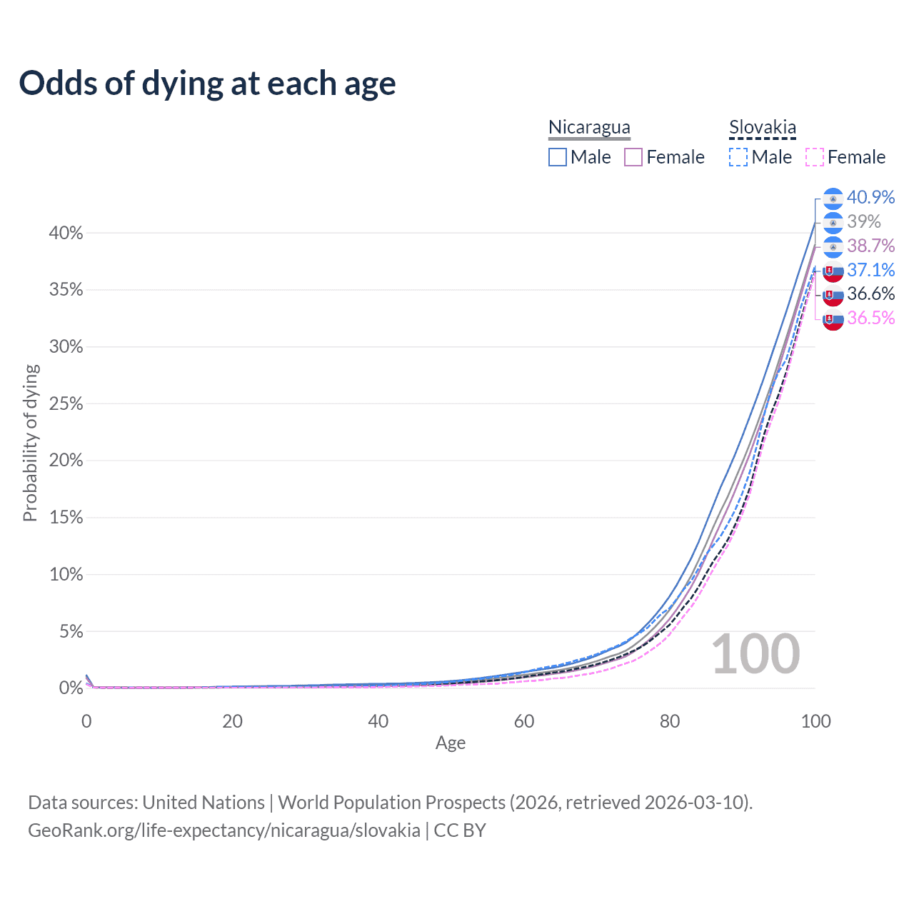 This life expectancy calculator shows the odds of living to 100, 95, 90, and below based on current age for both males and females in Nicaragua and Slovakia, along with mean and median age of death. The calculations are based on the 2026 life tables (actuarial tables) from the UN World Population Prospects.
