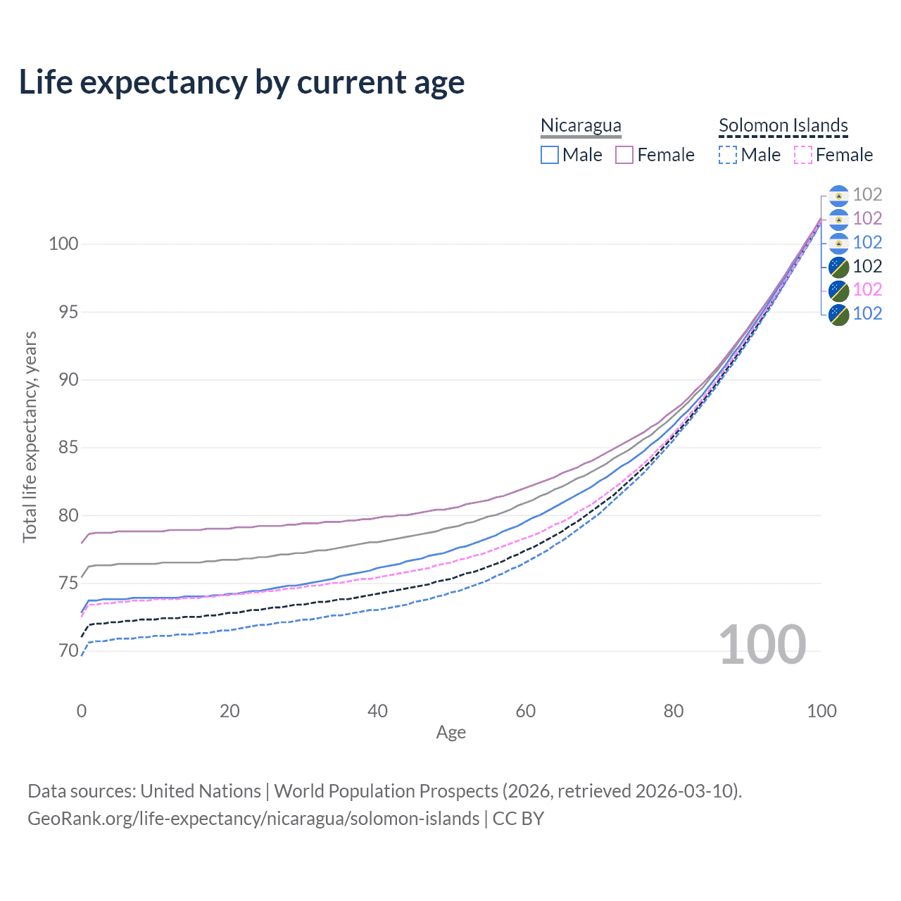 This life expectancy calculator shows the odds of living to 100, 95, 90, and below based on current age for both males and females in Nicaragua and the Solomon Islands, along with mean and median age of death. The calculations are based on the 2026 life tables (actuarial tables) from the UN World Population Prospects.