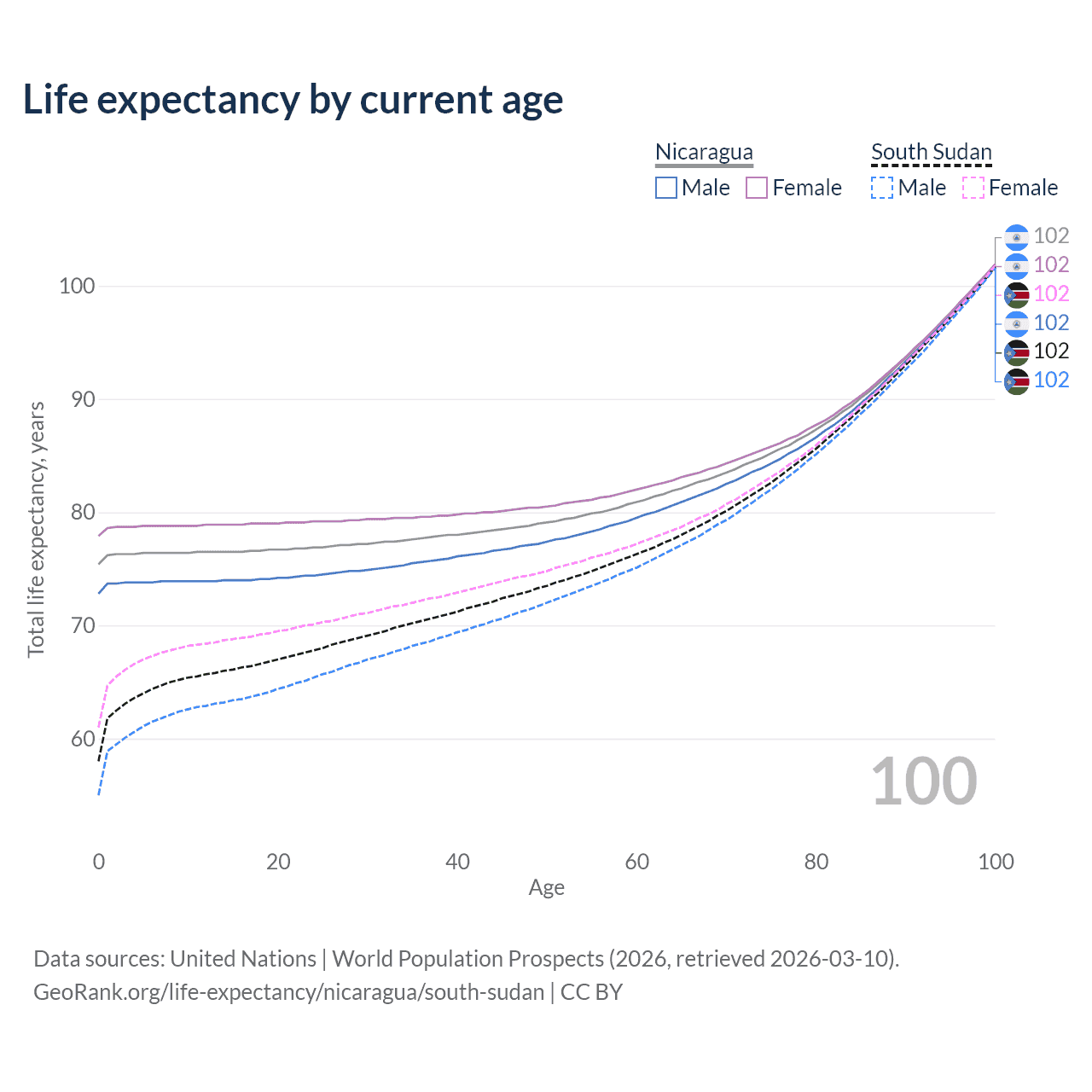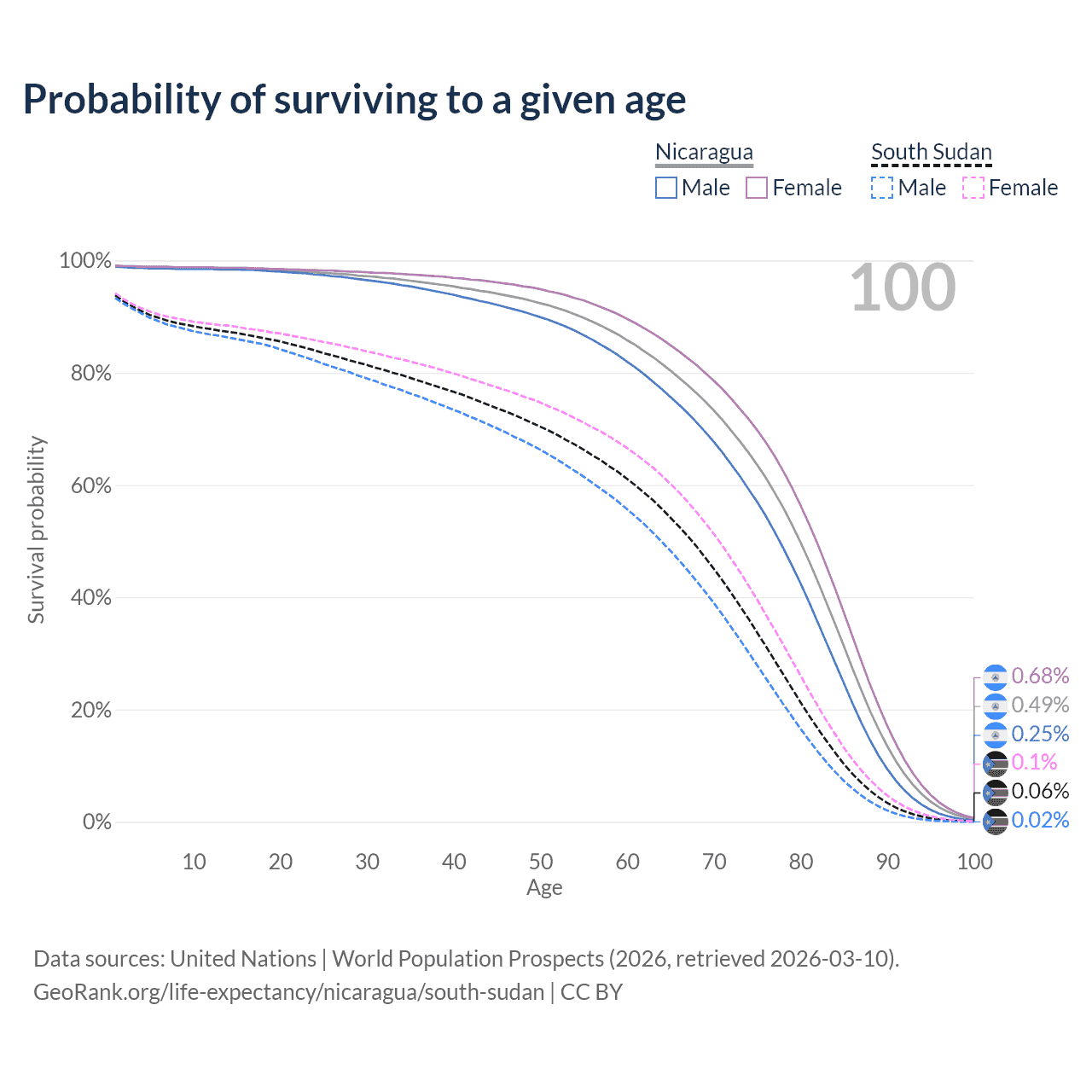 This life expectancy calculator shows the odds of living to 100, 95, 90, and below based on current age for both males and females in Nicaragua and South Sudan, along with mean and median age of death. The calculations are based on the 2026 life tables (actuarial tables) from the UN World Population Prospects.