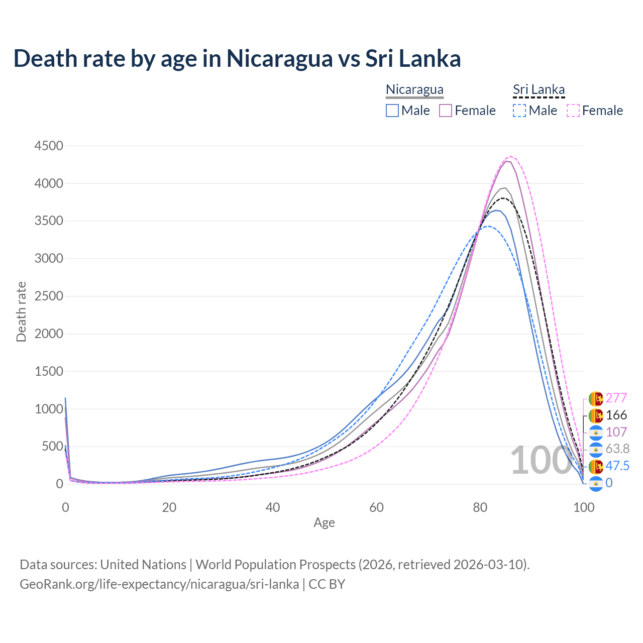 In Nicaragua, the most common age of death is 85, compared to 85 in Sri Lanka. The median age of death is 79.9 in Nicaragua and 81 in Sri Lanka, meaning only half of each cohort is expected to live past that age.