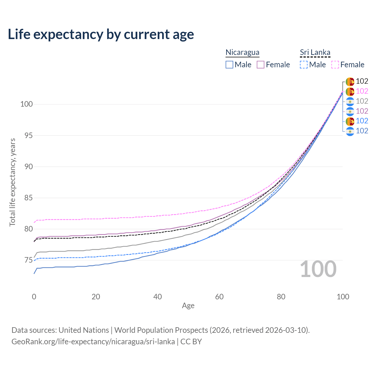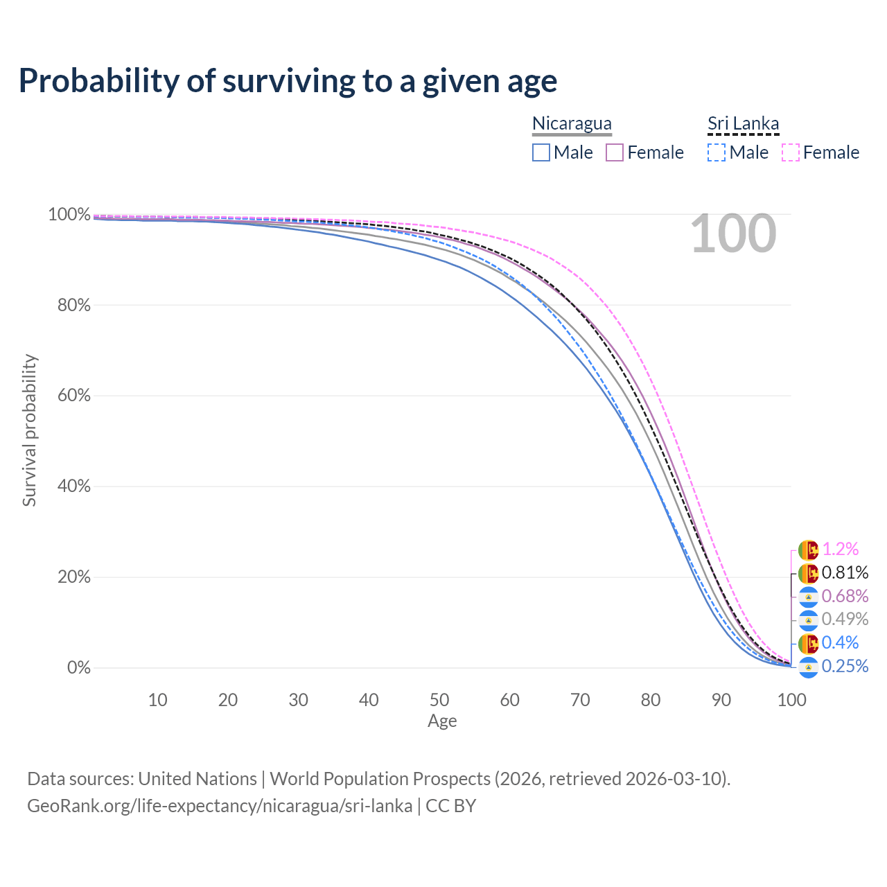 This life expectancy calculator shows the odds of living to 100, 95, 90, and below based on current age for both males and females in Nicaragua and Sri Lanka, along with mean and median age of death. The calculations are based on the 2026 life tables (actuarial tables) from the UN World Population Prospects.