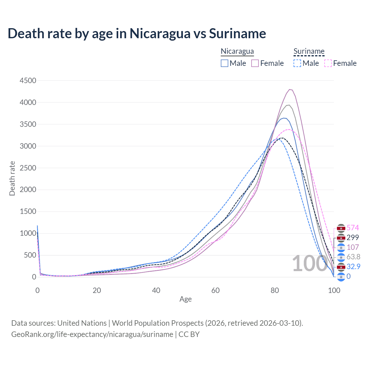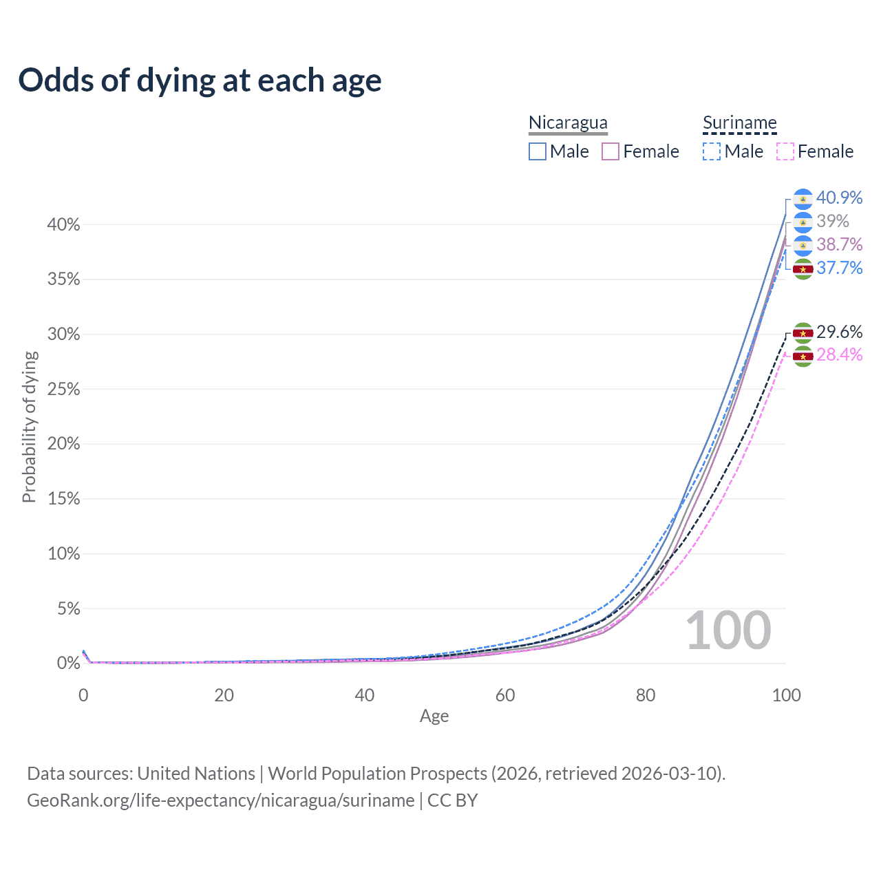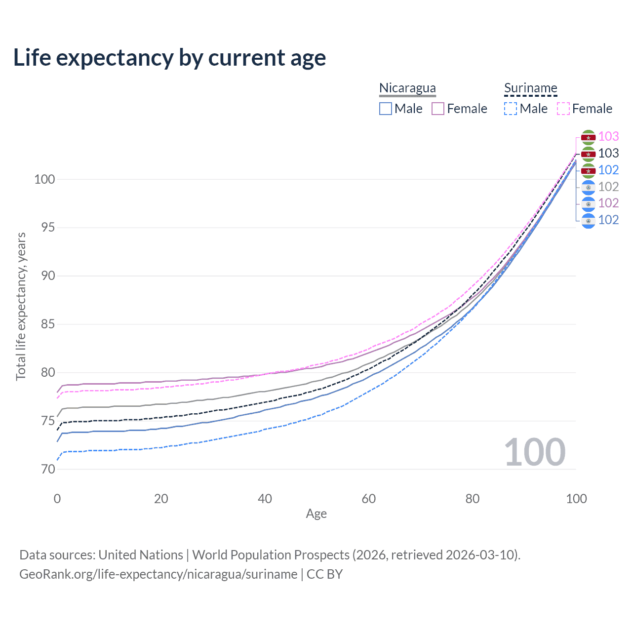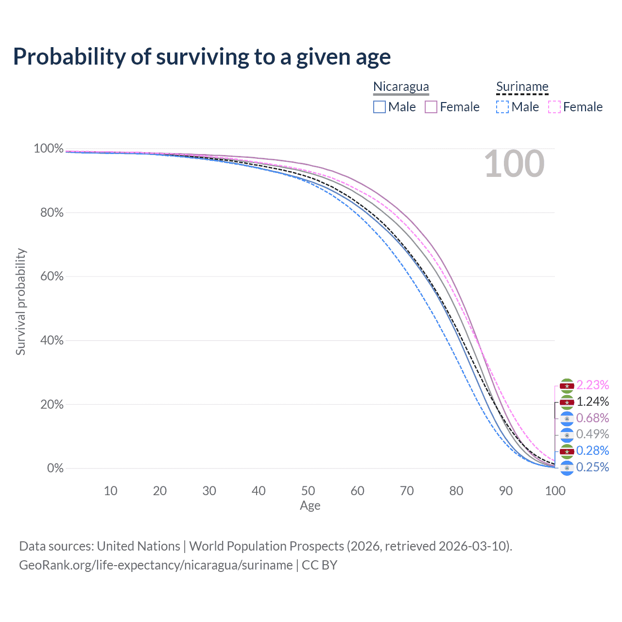 This life expectancy calculator shows the odds of living to 100, 95, 90, and below based on current age for both males and females in Nicaragua and Suriname, along with mean and median age of death. The calculations are based on the 2026 life tables (actuarial tables) from the UN World Population Prospects.