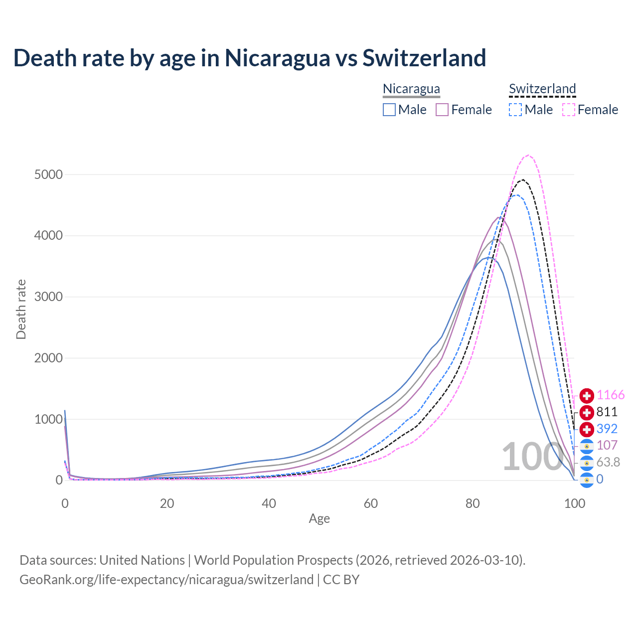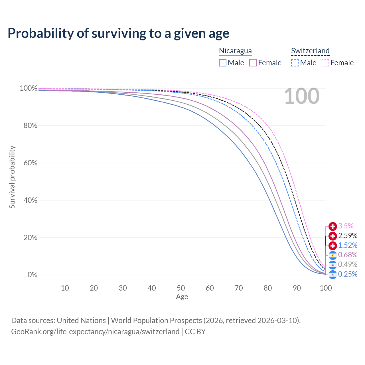 This life expectancy calculator shows the odds of living to 100, 95, 90, and below based on current age for both males and females in Nicaragua and Switzerland, along with mean and median age of death. The calculations are based on the 2026 life tables (actuarial tables) from the UN World Population Prospects.