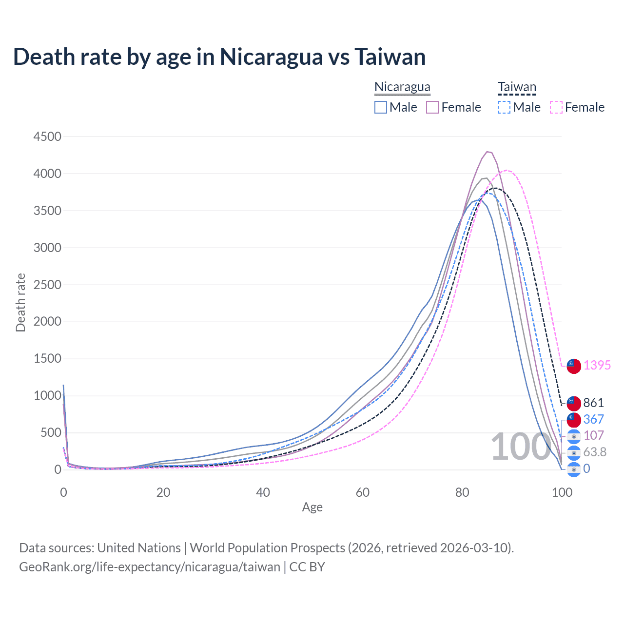 In Nicaragua, the most common age of death is 85, compared to 87 in Taiwan. The median age of death is 79.9 in Nicaragua and 84.3 in Taiwan, meaning only half of each cohort is expected to live past that age.