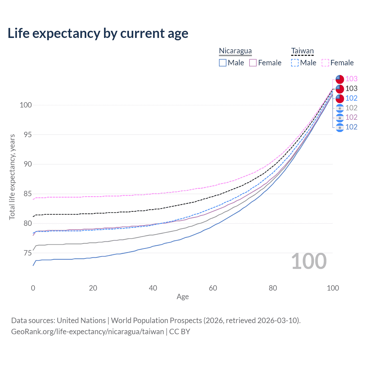 The average life expectancy at birth is 75.4 years in Nicaragua vs 81.1 in Taiwan. Nicaragua is ranked 91/197 by life expectancy, and Taiwan is 40/197. In Nicaragua, the life expectancy is 72.8 years for males and 77.9 years for females. In Taiwan, it's 78.3 years for males and 84 years for females.