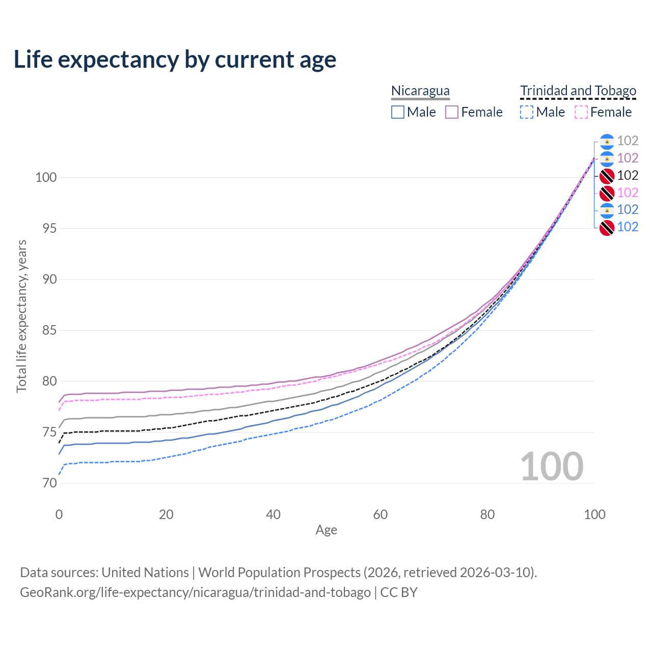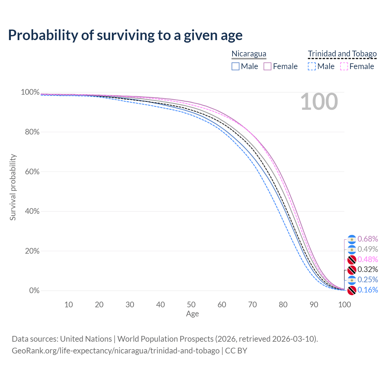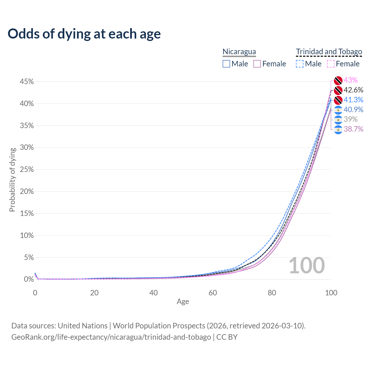 This life expectancy calculator shows the odds of living to 100, 95, 90, and below based on current age for both males and females in Nicaragua and Trinidad and Tobago, along with mean and median age of death. The calculations are based on the 2026 life tables (actuarial tables) from the UN World Population Prospects.