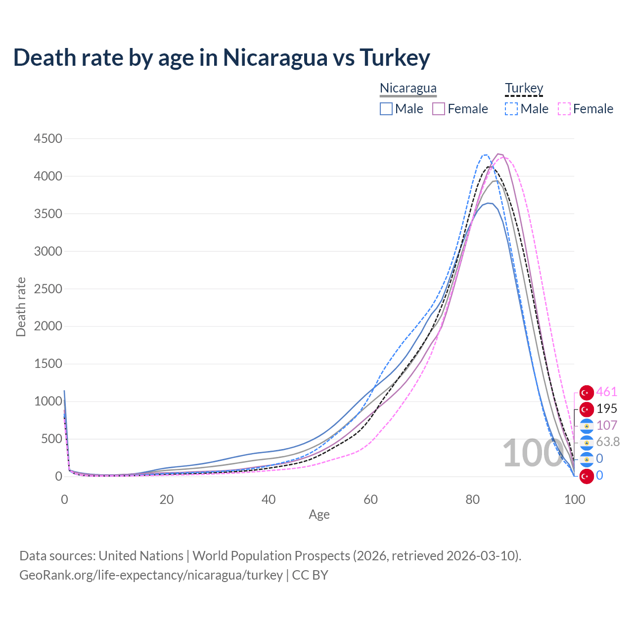 This life expectancy calculator shows the odds of living to 100, 95, 90, and below based on current age for both males and females in Nicaragua and Turkey, along with mean and median age of death. The calculations are based on the 2026 life tables (actuarial tables) from the UN World Population Prospects.