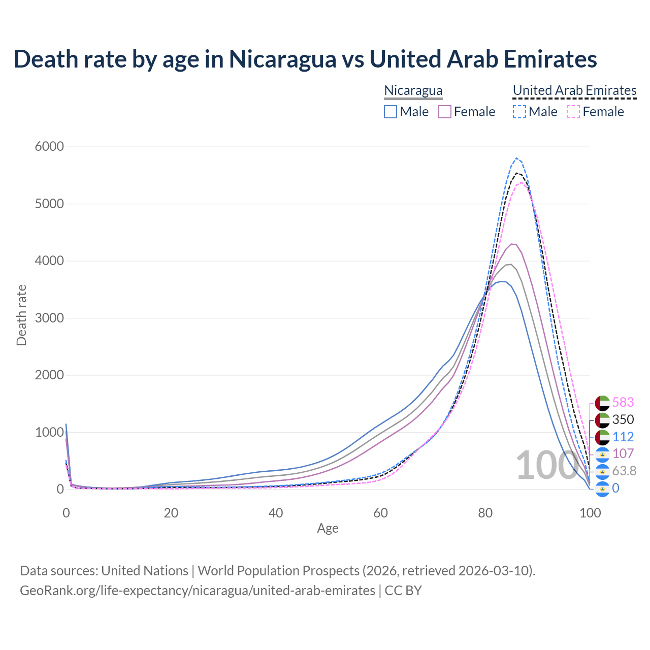 In Nicaragua, the most common age of death is 85, compared to 86 in the United Arab Emirates. The median age of death is 79.9 in Nicaragua and 85.6 in the United Arab Emirates, meaning only half of each cohort is expected to live past that age.