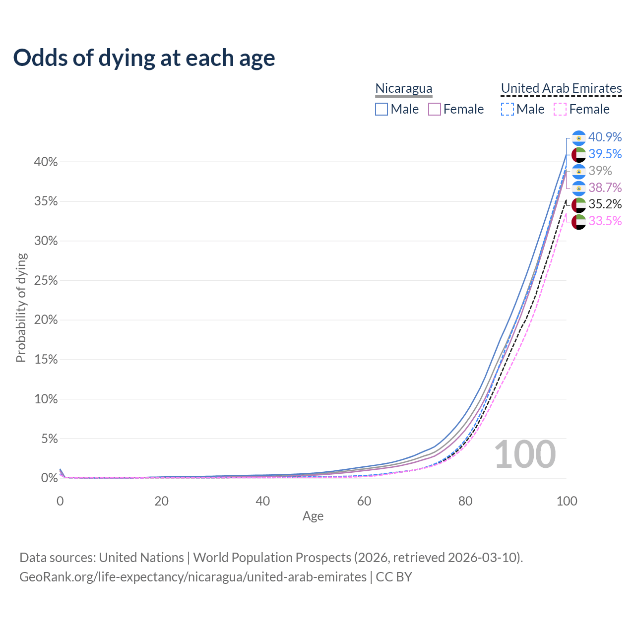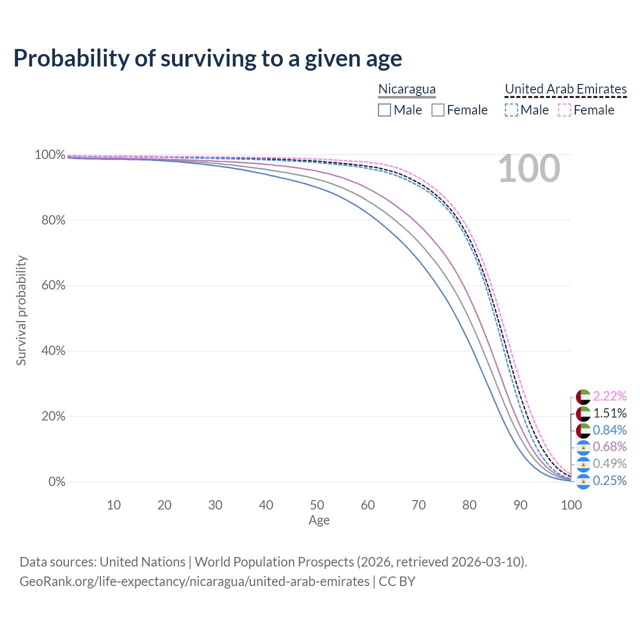 This life expectancy calculator shows the odds of living to 100, 95, 90, and below based on current age for both males and females in Nicaragua and the United Arab Emirates, along with mean and median age of death. The calculations are based on the 2026 life tables (actuarial tables) from the UN World Population Prospects.