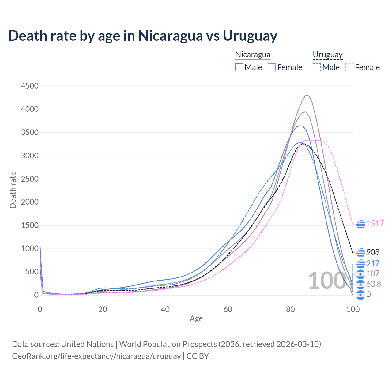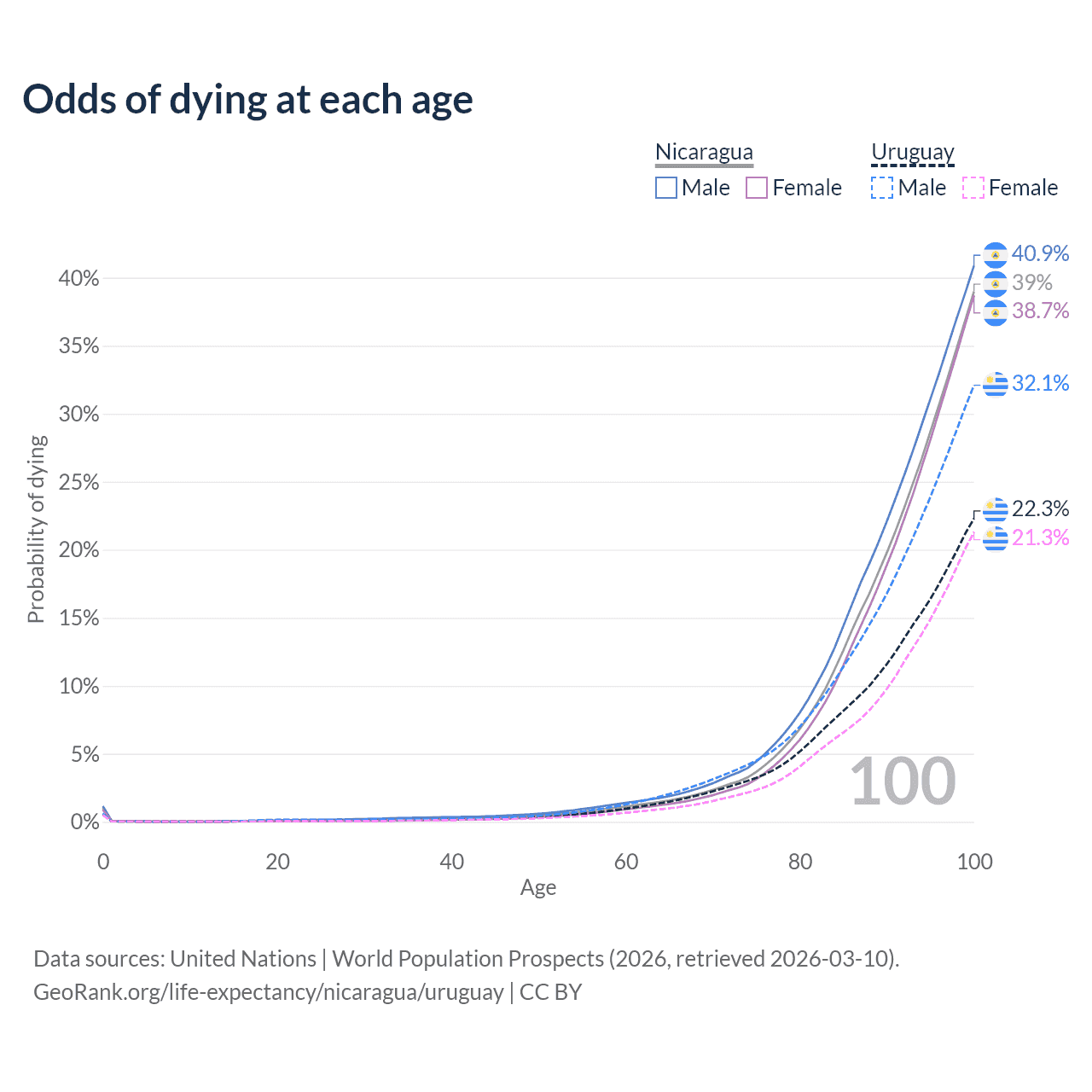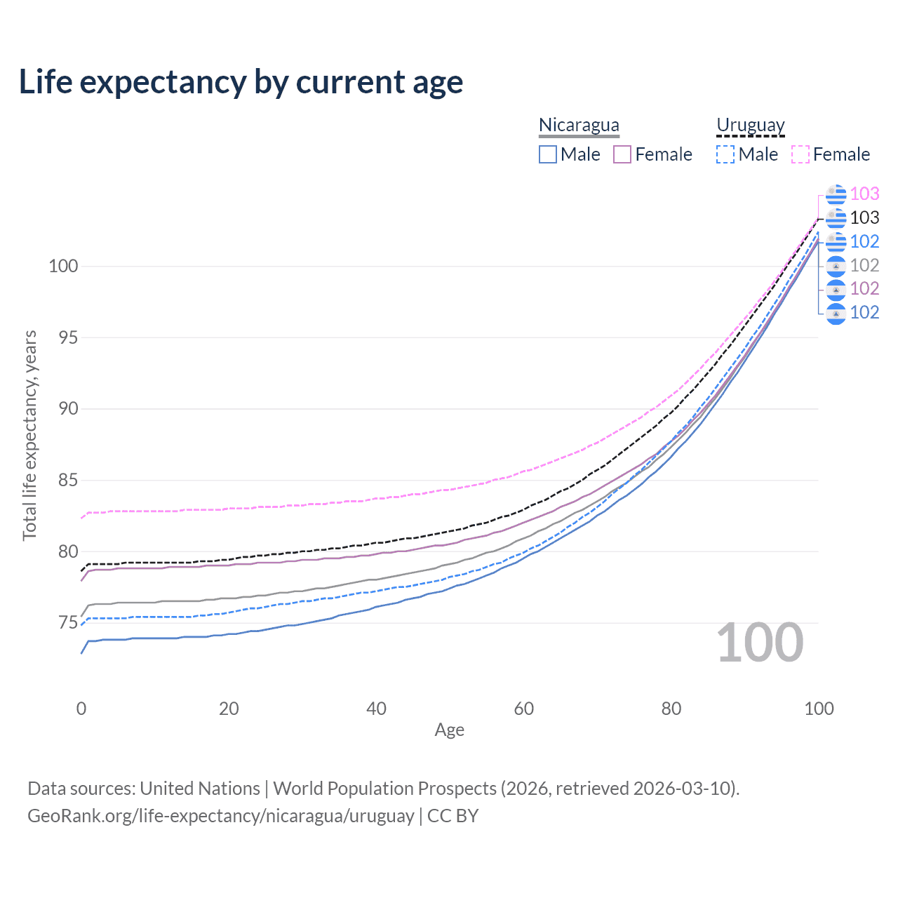 This life expectancy calculator shows the odds of living to 100, 95, 90, and below based on current age for both males and females in Nicaragua and Uruguay, along with mean and median age of death. The calculations are based on the 2026 life tables (actuarial tables) from the UN World Population Prospects.