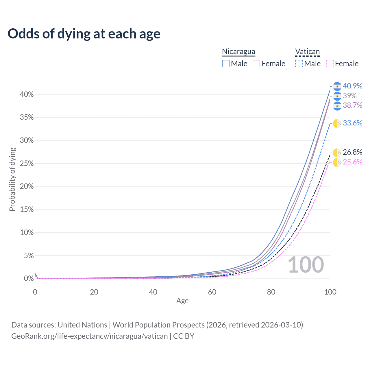 This life expectancy calculator shows the odds of living to 100, 95, 90, and below based on current age for both males and females in Nicaragua and the Vatican, along with mean and median age of death. The calculations are based on the 2026 life tables (actuarial tables) from the UN World Population Prospects.
