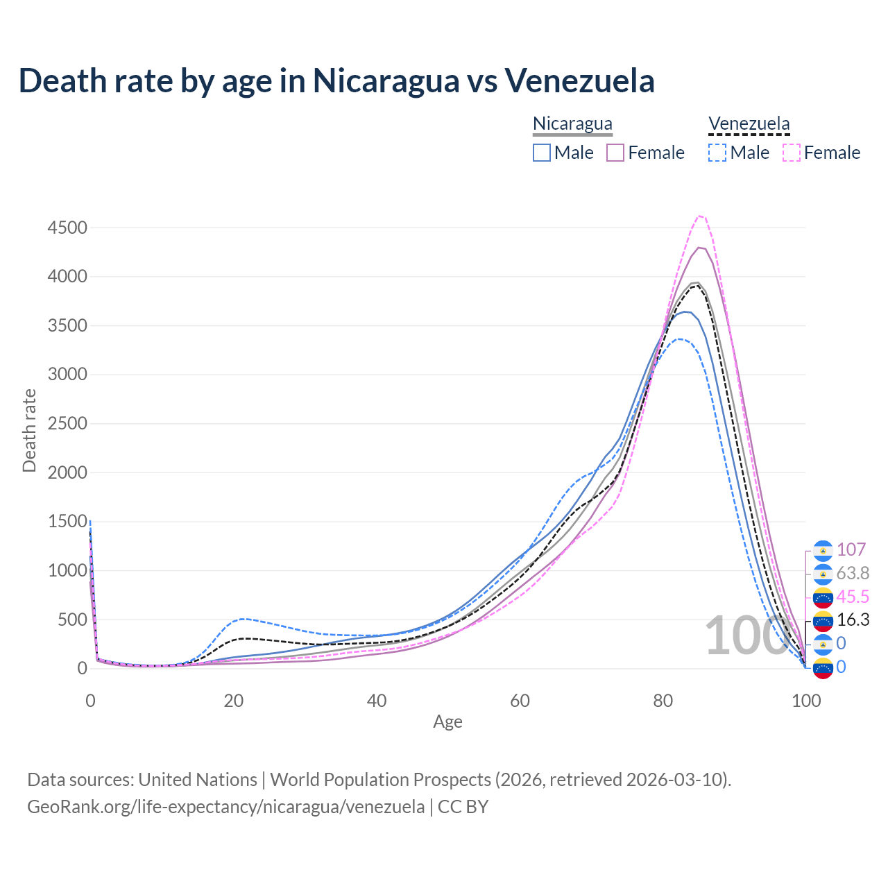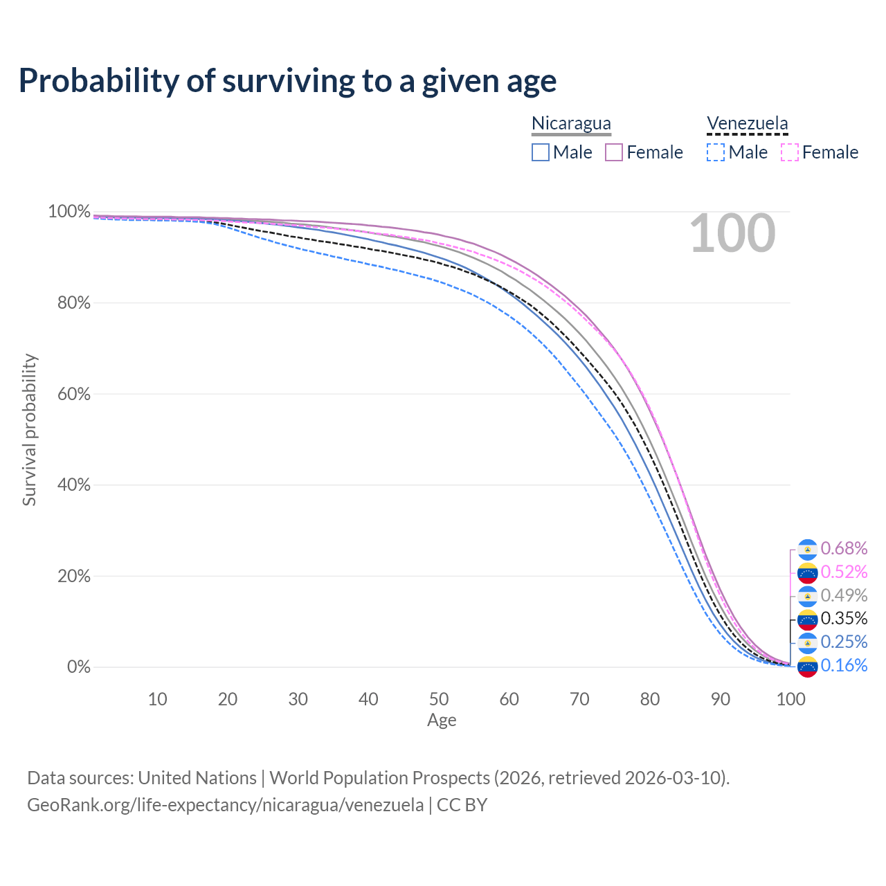 This life expectancy calculator shows the odds of living to 100, 95, 90, and below based on current age for both males and females in Nicaragua and Venezuela, along with mean and median age of death. The calculations are based on the 2026 life tables (actuarial tables) from the UN World Population Prospects.