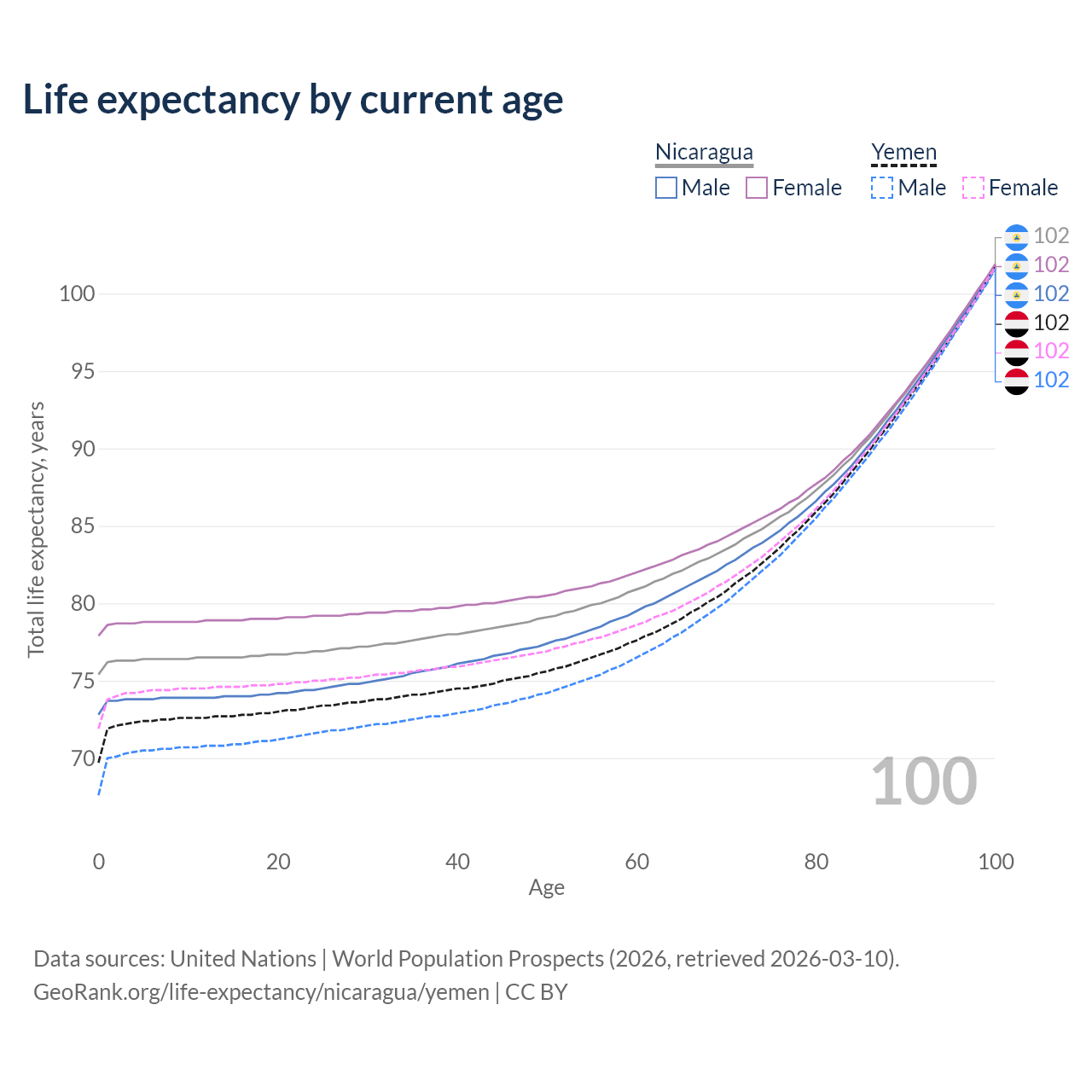 This life expectancy calculator shows the odds of living to 100, 95, 90, and below based on current age for both males and females in Nicaragua and Yemen, along with mean and median age of death. The calculations are based on the 2026 life tables (actuarial tables) from the UN World Population Prospects.