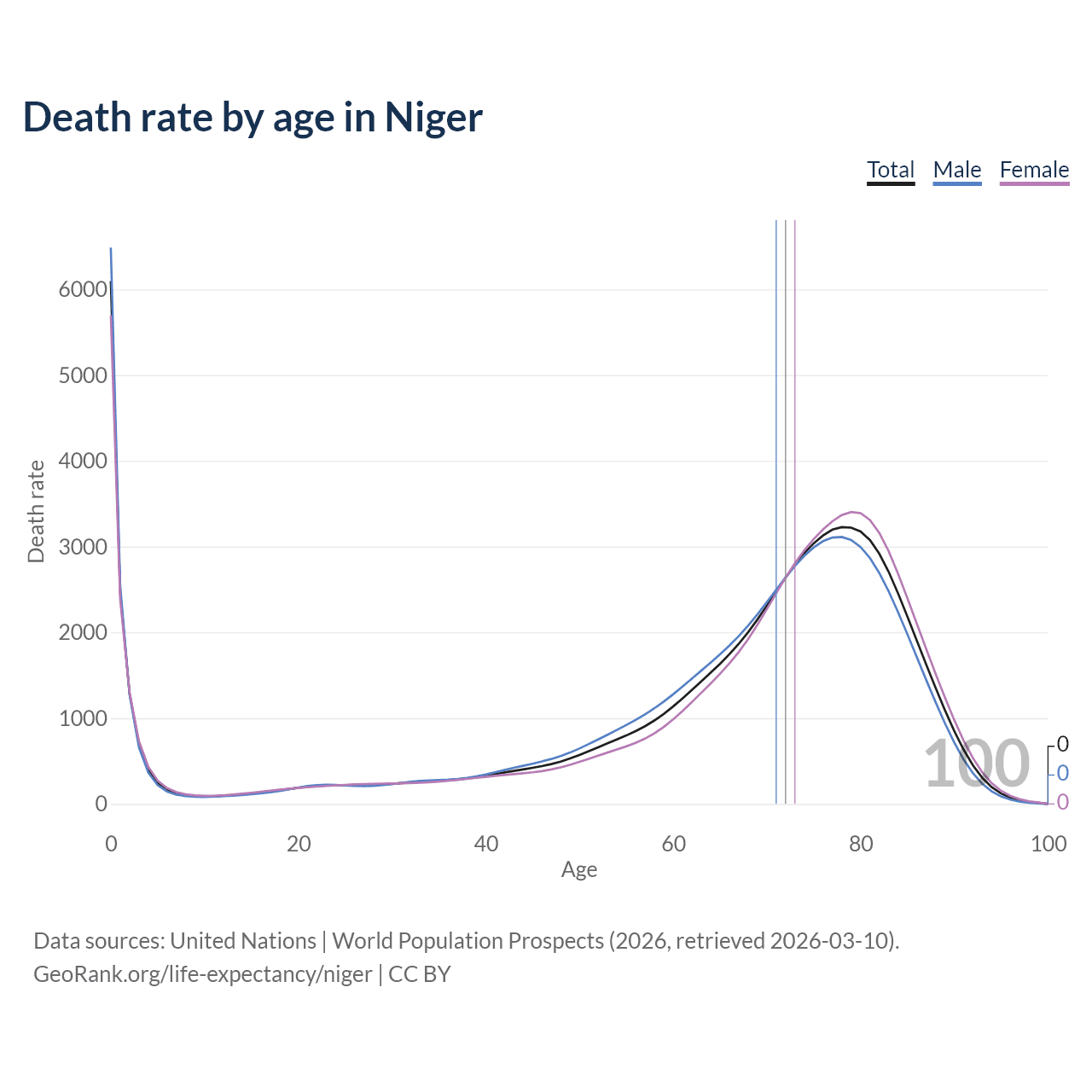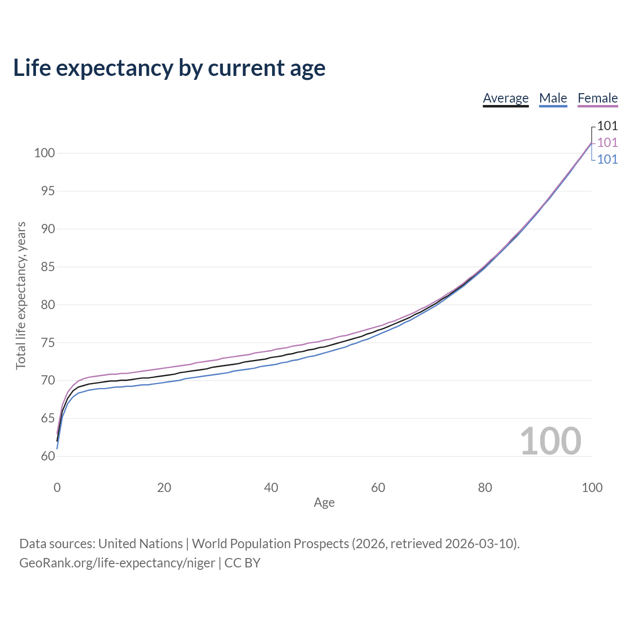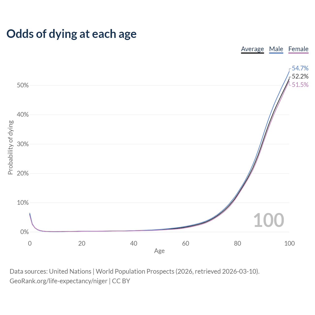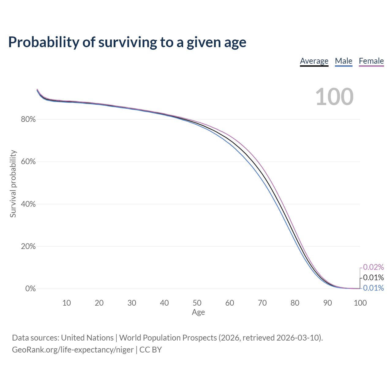 This life expectancy calculator shows the odds of living to 100, 95, 90, and below based on current age for both males and females in Niger, along with mean and median age of death. The calculations are based on the 2026 life tables (actuarial tables) from the UN World Population Prospects.
