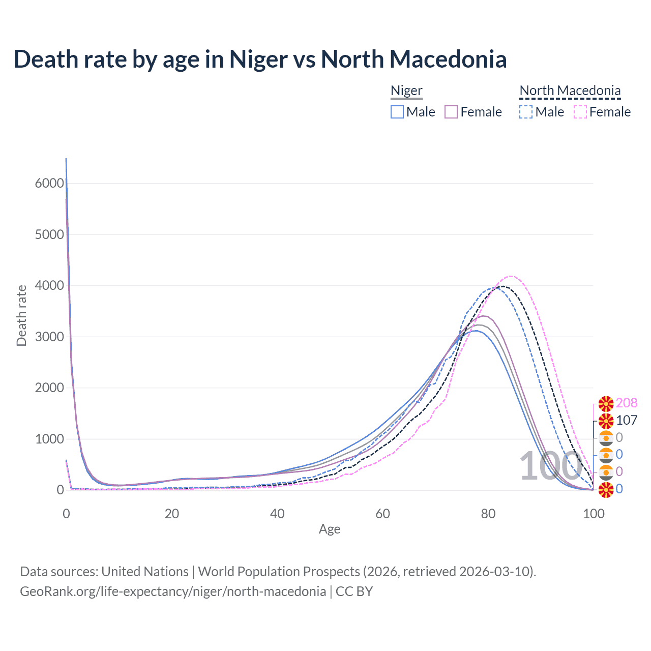 In Niger, the most common age of death is 0, compared to 83 in North Macedonia. The median age of death is 71.7 in Niger and 80.3 in North Macedonia, meaning only half of each cohort is expected to live past that age.