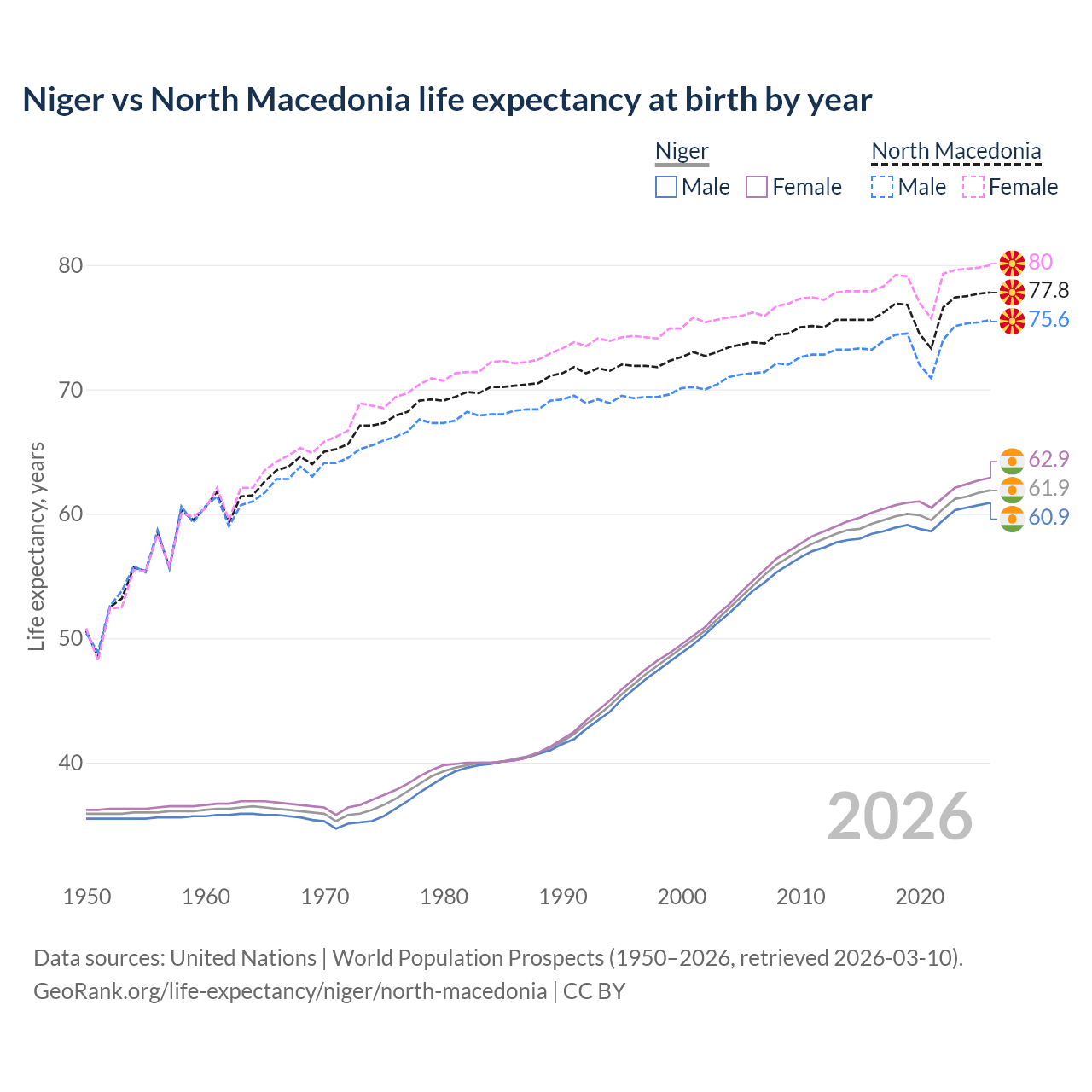 The average life expectancy at birth is 61.9 years in Niger vs 77.8 in North Macedonia. Niger is ranked 187/197 by life expectancy, and North Macedonia is 67/197. In Niger, the life expectancy is 60.9 years for males and 62.9 years for females. In North Macedonia, it's 75.6 years for males and 80 years for females.
