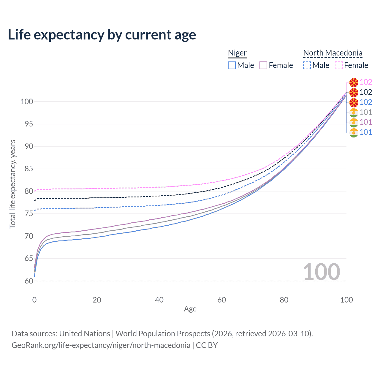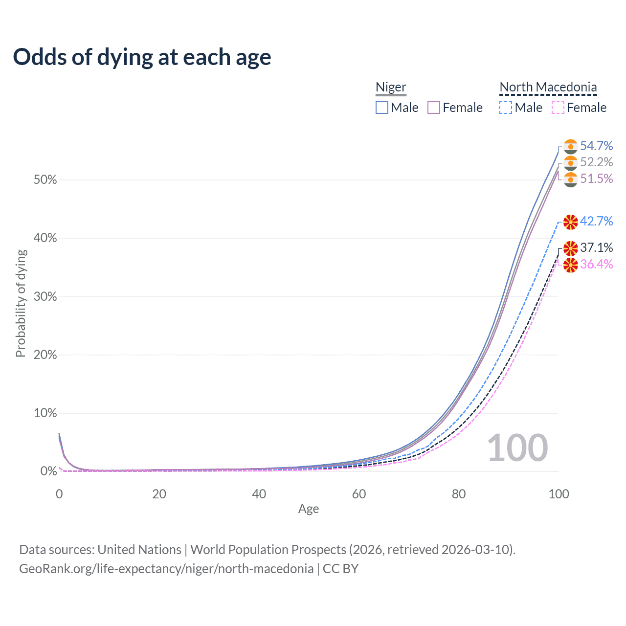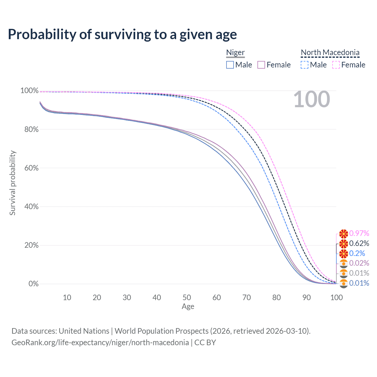 This life expectancy calculator shows the odds of living to 100, 95, 90, and below based on current age for both males and females in Niger and North Macedonia, along with mean and median age of death. The calculations are based on the 2026 life tables (actuarial tables) from the UN World Population Prospects.