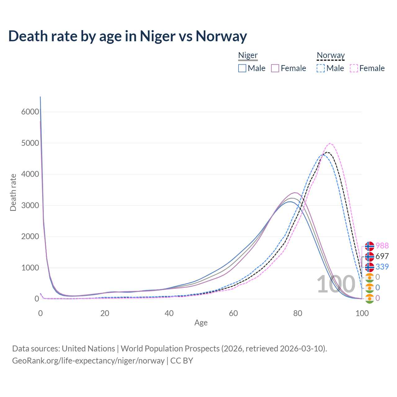 In Niger, the most common age of death is 0, compared to 89 in Norway. The median age of death is 71.7 in Niger and 86.5 in Norway, meaning only half of each cohort is expected to live past that age.