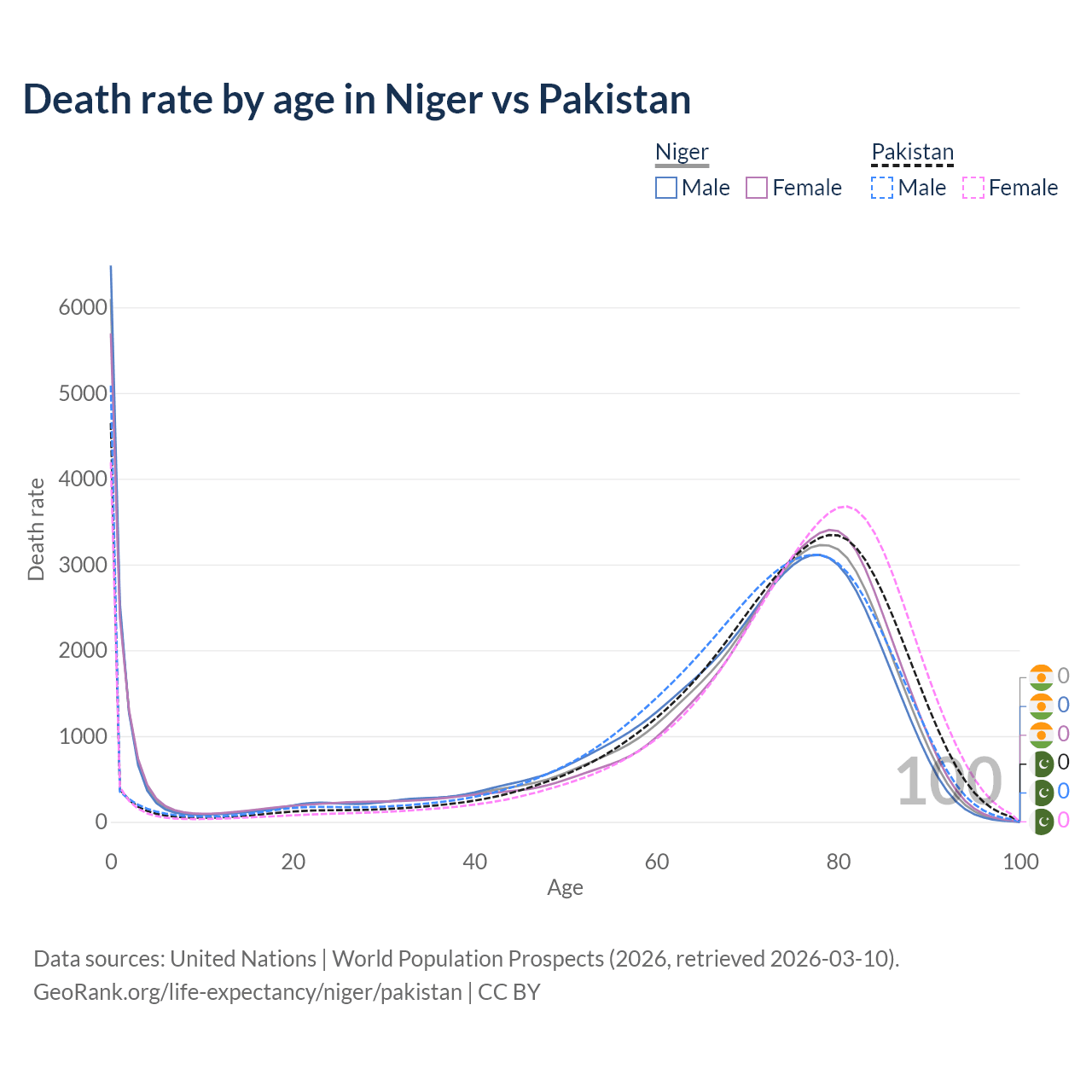 In Niger, the most common age of death is 0, compared to 0 in Pakistan. The median age of death is 71.7 in Niger and 74.3 in Pakistan, meaning only half of each cohort is expected to live past that age.