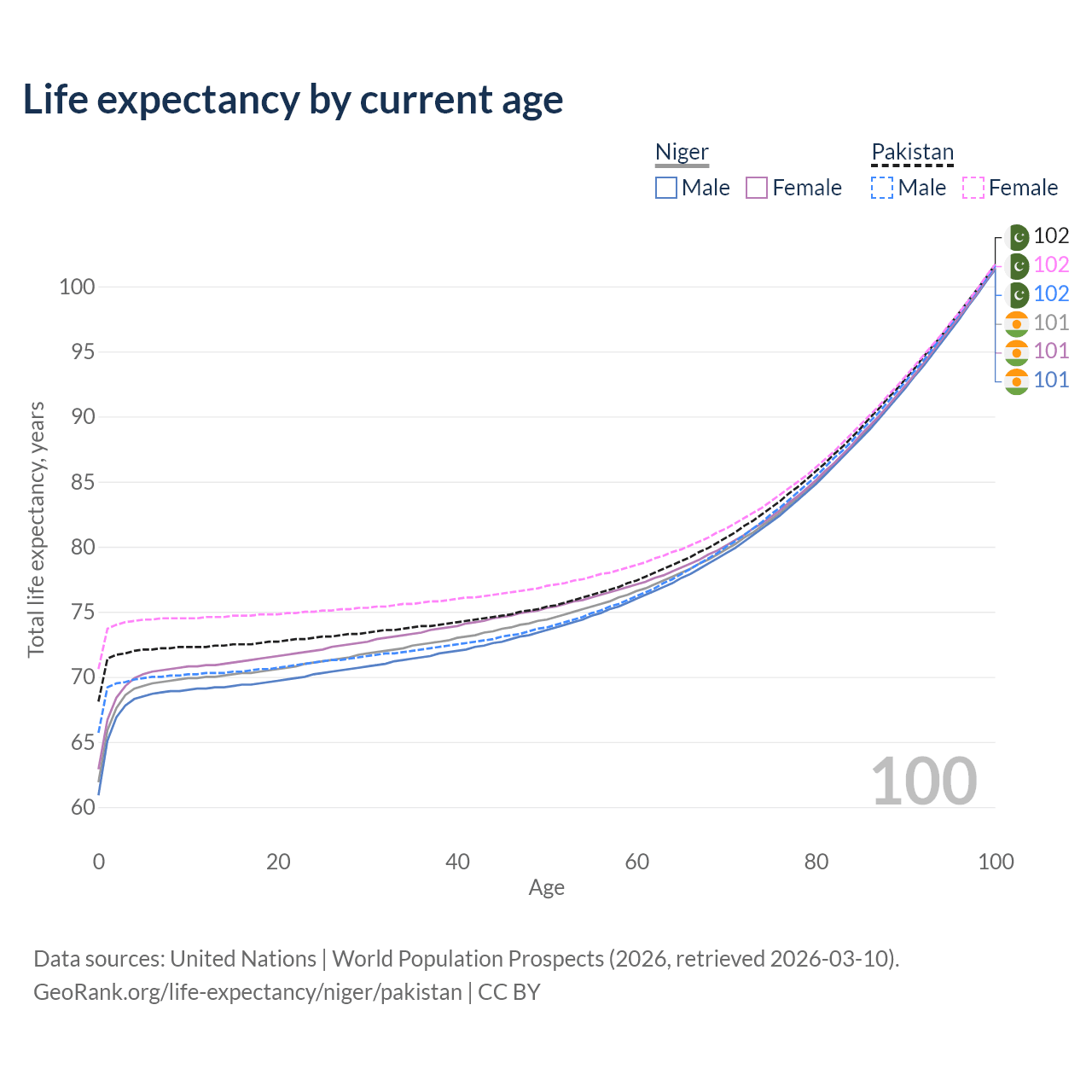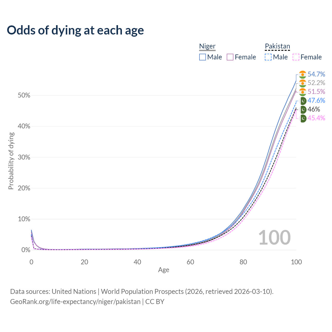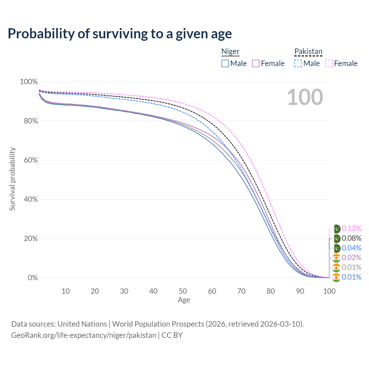This life expectancy calculator shows the odds of living to 100, 95, 90, and below based on current age for both males and females in Niger and Pakistan, along with mean and median age of death. The calculations are based on the 2026 life tables (actuarial tables) from the UN World Population Prospects.