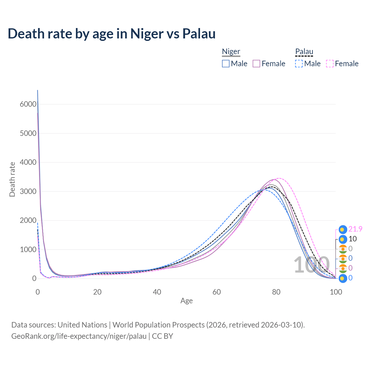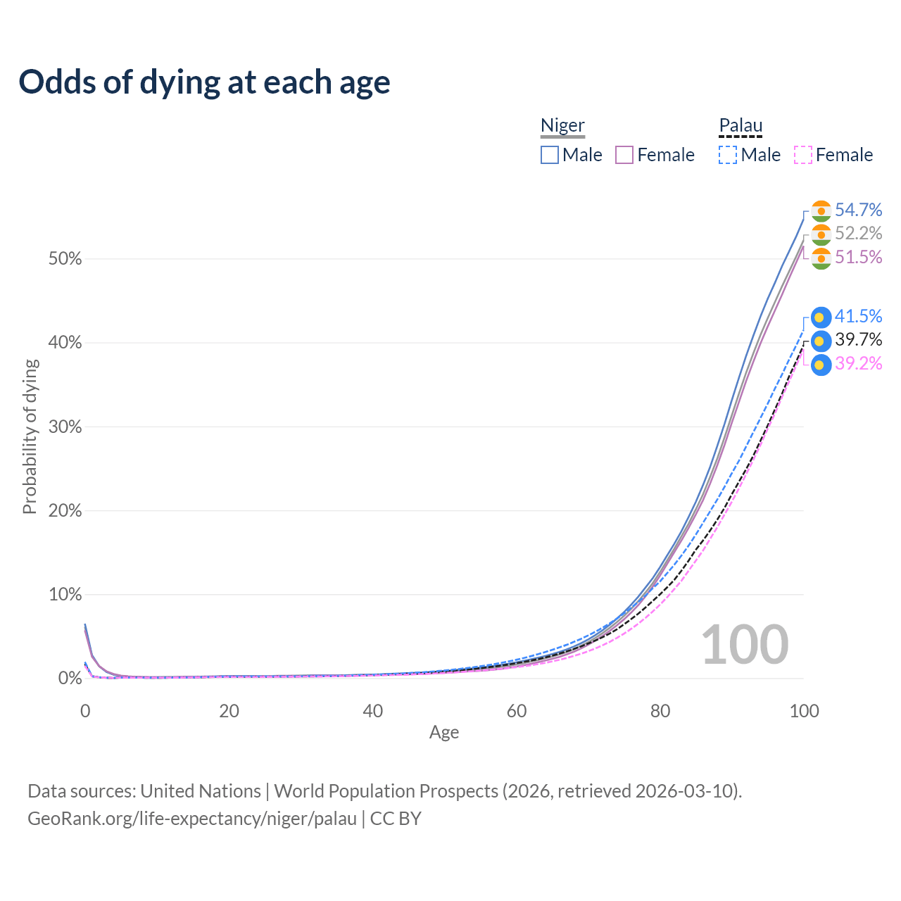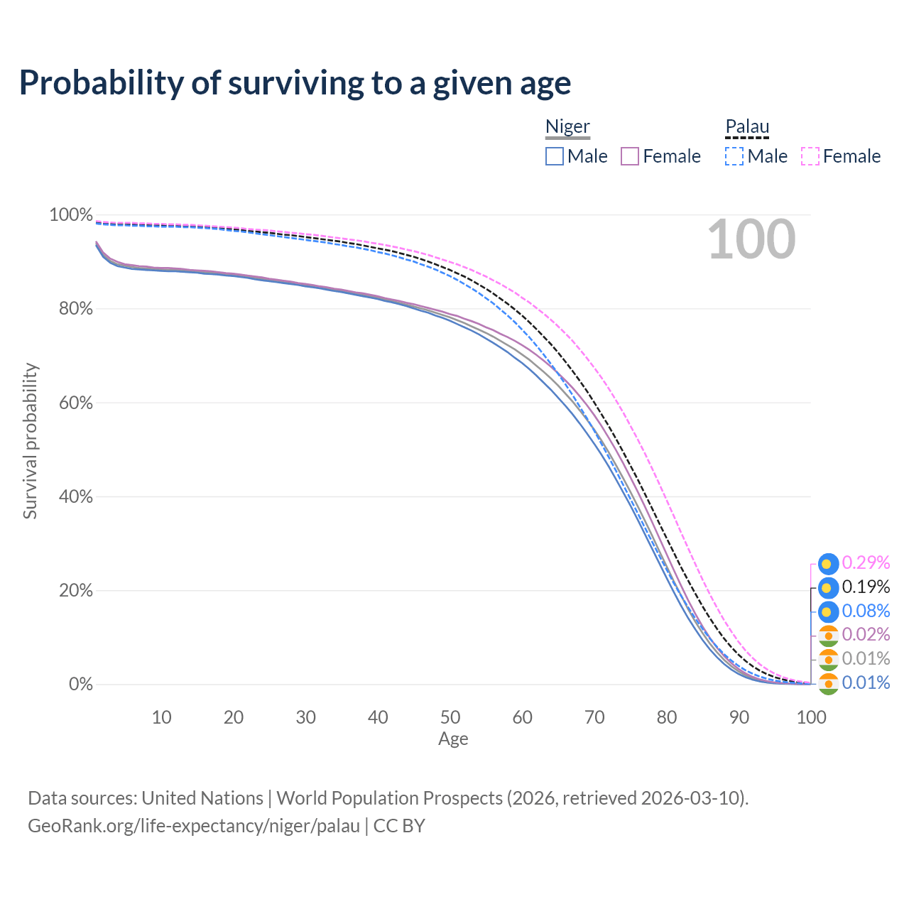 This life expectancy calculator shows the odds of living to 100, 95, 90, and below based on current age for both males and females in Niger and Palau, along with mean and median age of death. The calculations are based on the 2026 life tables (actuarial tables) from the UN World Population Prospects.