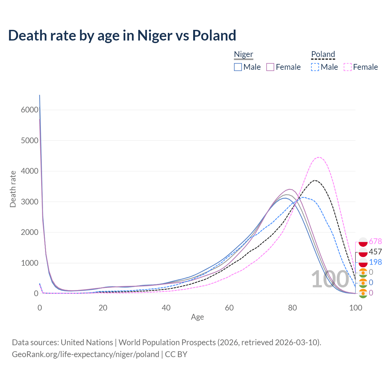 In Niger, the most common age of death is 0, compared to 87 in Poland. The median age of death is 71.7 in Niger and 82.5 in Poland, meaning only half of each cohort is expected to live past that age.