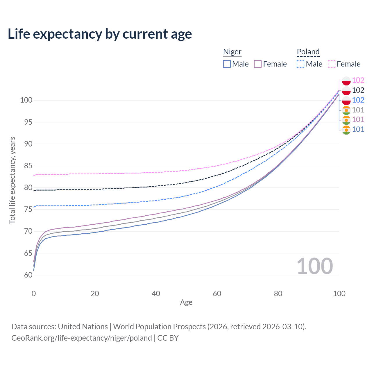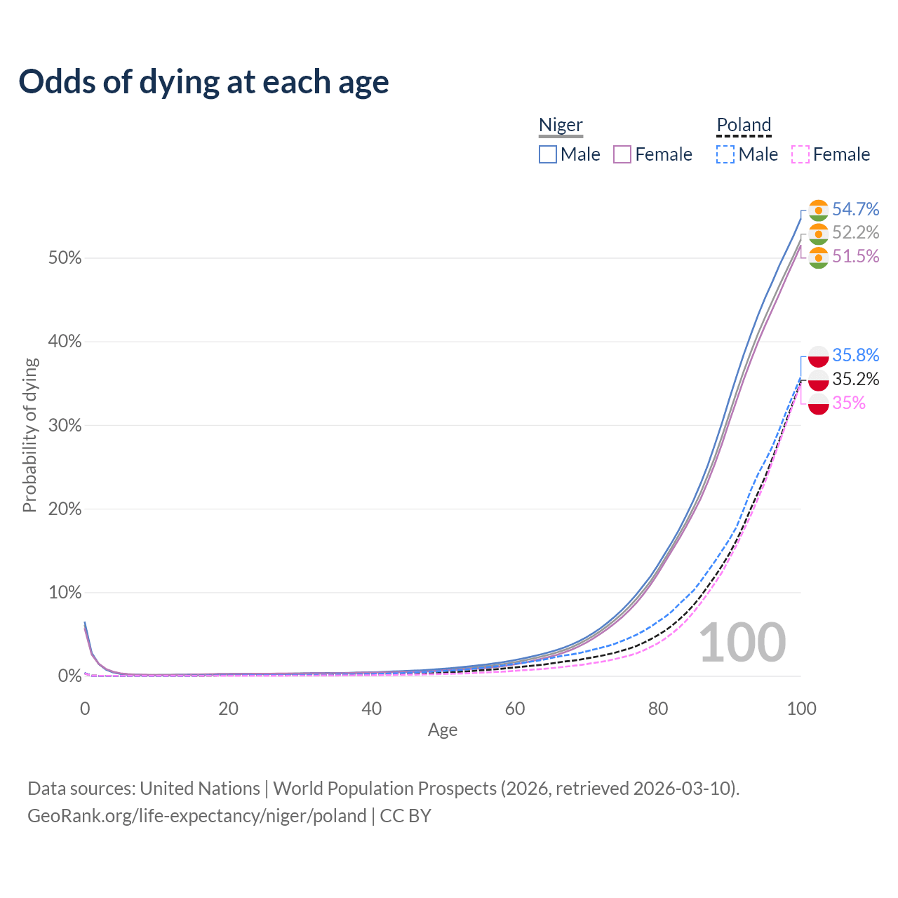 This life expectancy calculator shows the odds of living to 100, 95, 90, and below based on current age for both males and females in Niger and Poland, along with mean and median age of death. The calculations are based on the 2026 life tables (actuarial tables) from the UN World Population Prospects.