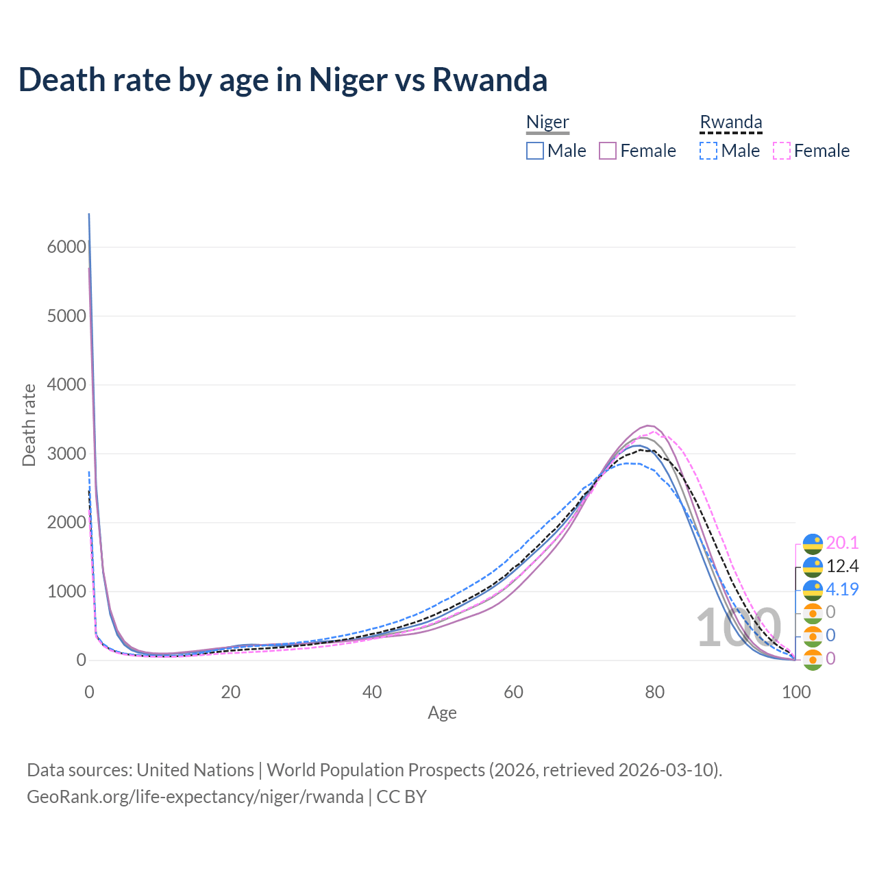 In Niger, the most common age of death is 0, compared to 78 in Rwanda. The median age of death is 71.7 in Niger and 73.5 in Rwanda, meaning only half of each cohort is expected to live past that age.