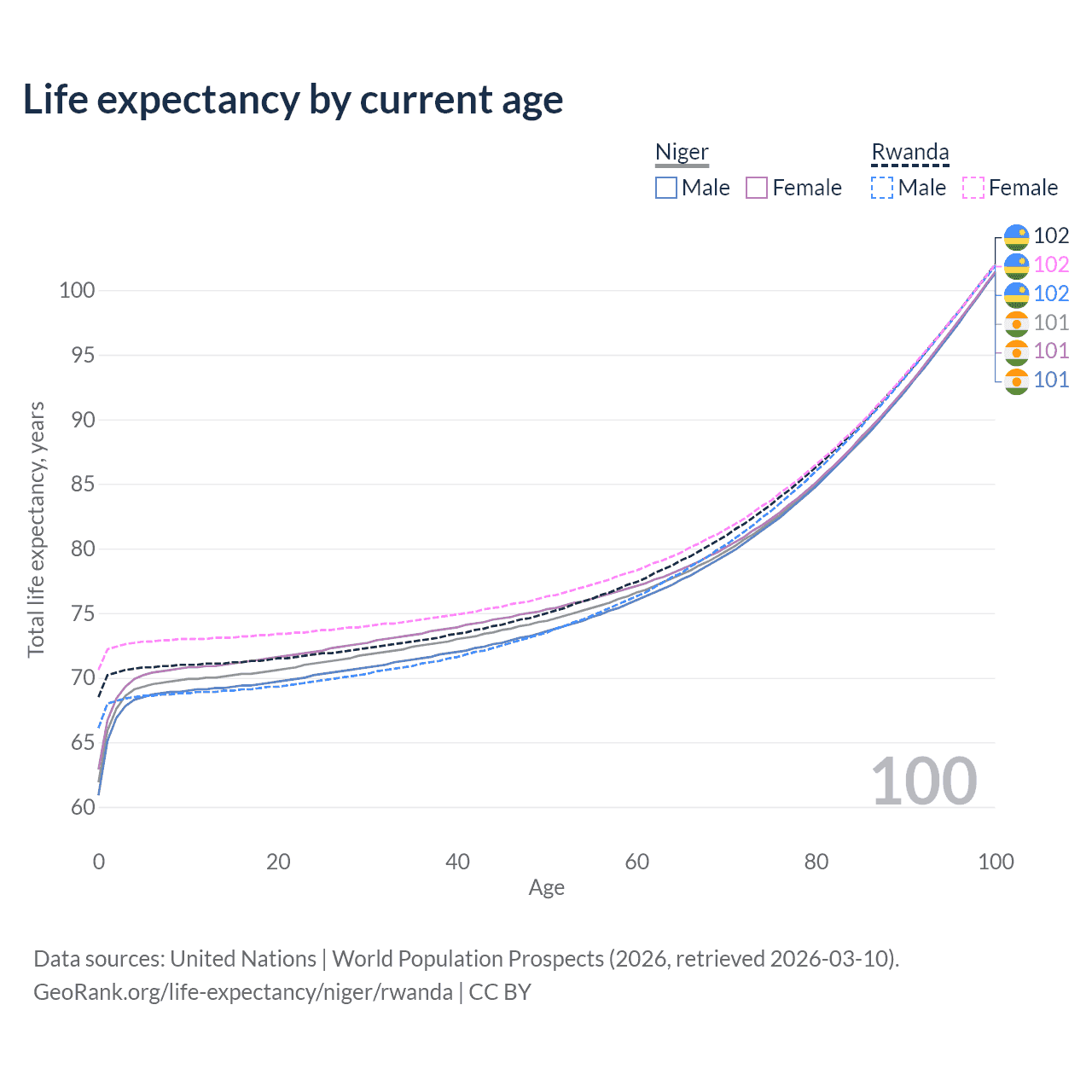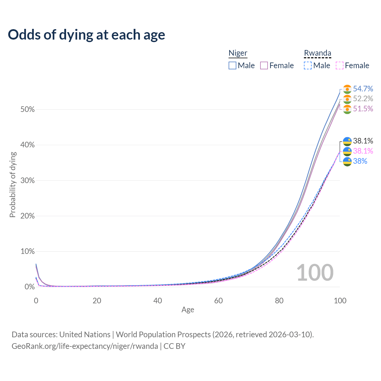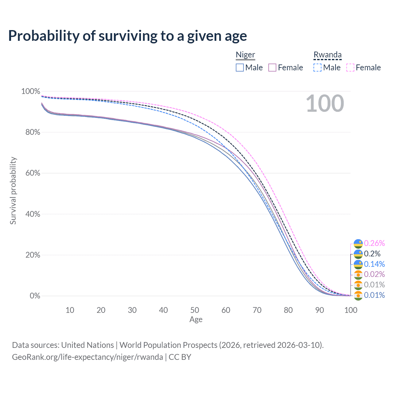 This life expectancy calculator shows the odds of living to 100, 95, 90, and below based on current age for both males and females in Niger and Rwanda, along with mean and median age of death. The calculations are based on the 2026 life tables (actuarial tables) from the UN World Population Prospects.