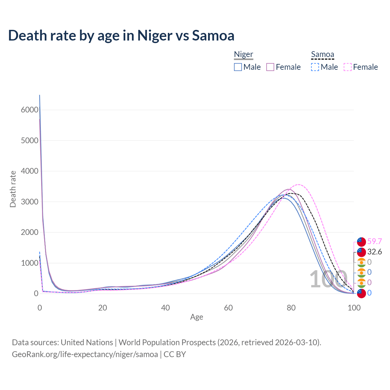In Niger, the most common age of death is 0, compared to 80 in Samoa. The median age of death is 71.7 in Niger and 75.9 in Samoa, meaning only half of each cohort is expected to live past that age.