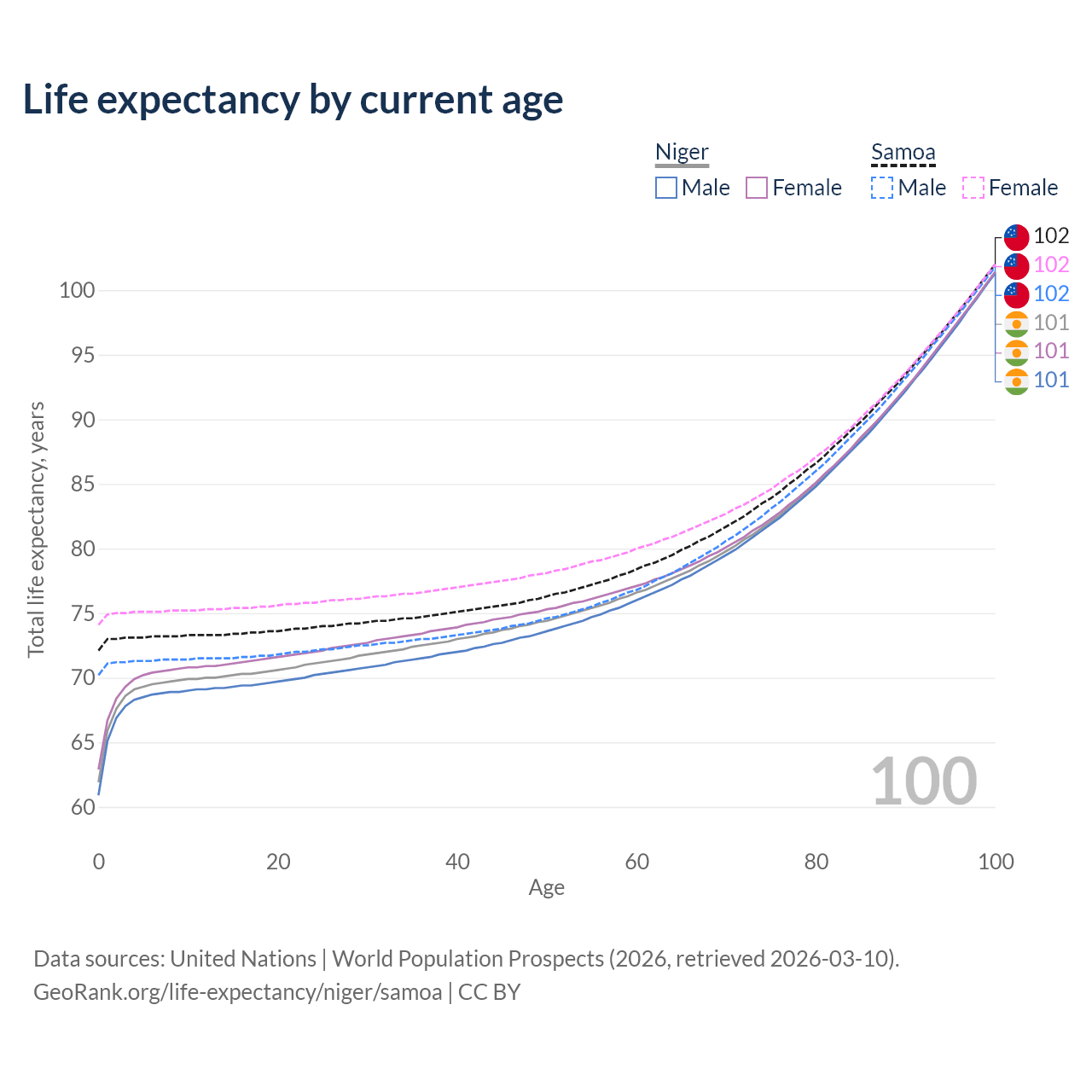 The average life expectancy at birth is 61.9 years in Niger vs 72.1 in Samoa. Niger is ranked 187/197 by life expectancy, and Samoa is 124/197. In Niger, the life expectancy is 60.9 years for males and 62.9 years for females. In Samoa, it's 70.2 years for males and 74.1 years for females.