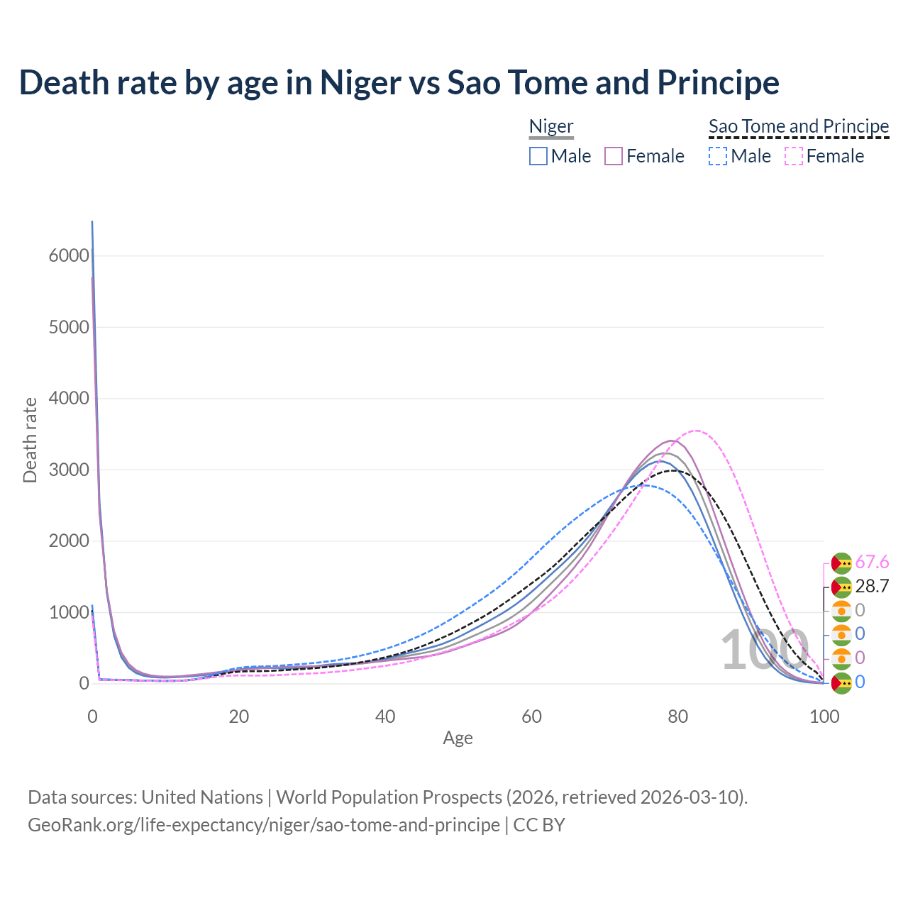 In Niger, the most common age of death is 0, compared to 79 in Sao Tome and Principe. The median age of death is 71.7 in Niger and 74.1 in Sao Tome and Principe, meaning only half of each cohort is expected to live past that age.