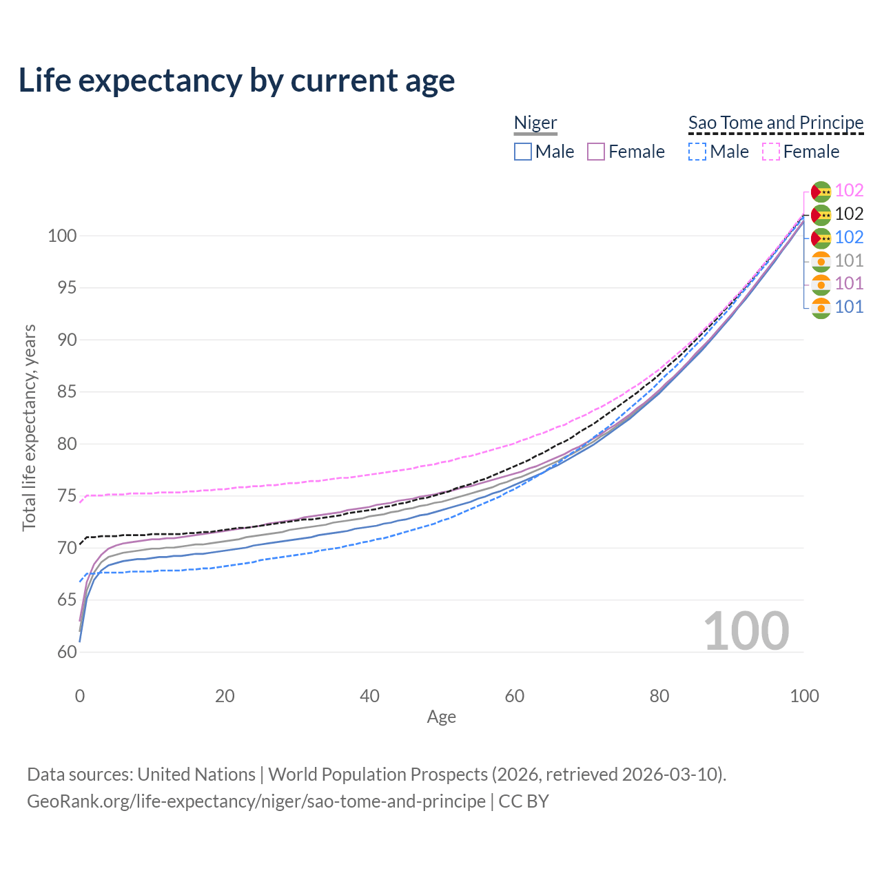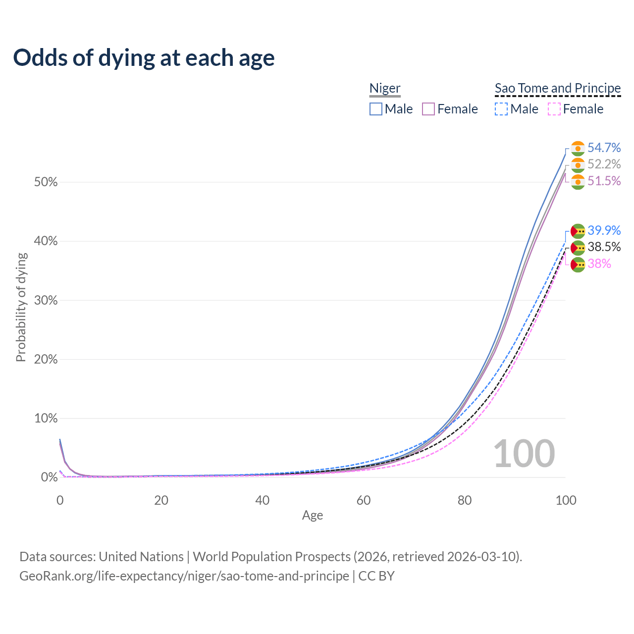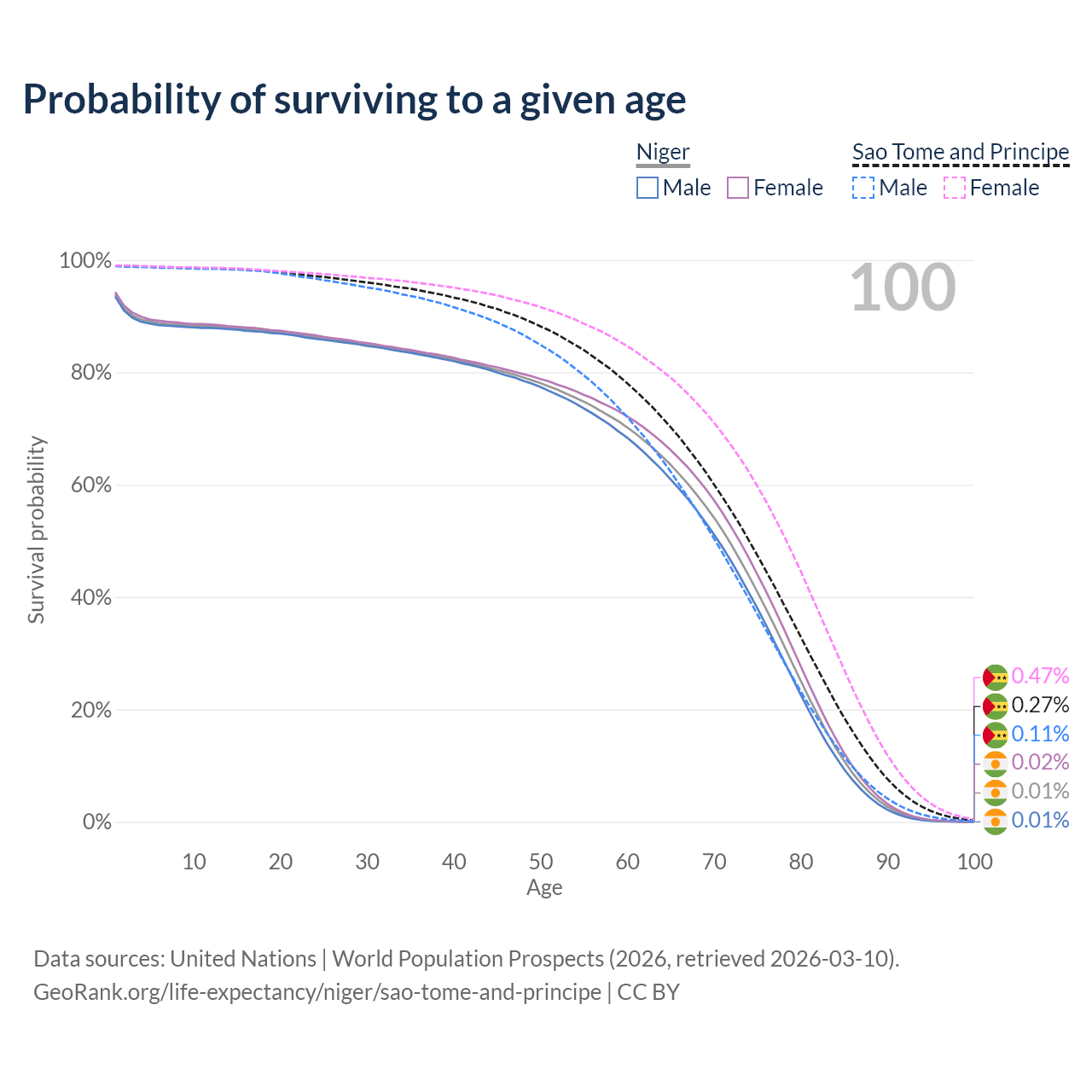 This life expectancy calculator shows the odds of living to 100, 95, 90, and below based on current age for both males and females in Niger and Sao Tome and Principe, along with mean and median age of death. The calculations are based on the 2026 life tables (actuarial tables) from the UN World Population Prospects.