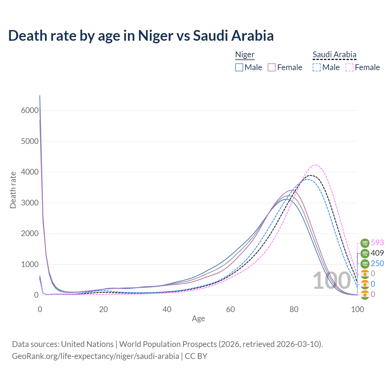 In Niger, the most common age of death is 0, compared to 85 in Saudi Arabia. The median age of death is 71.7 in Niger and 82.5 in Saudi Arabia, meaning only half of each cohort is expected to live past that age.