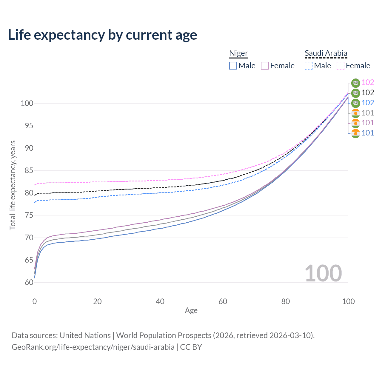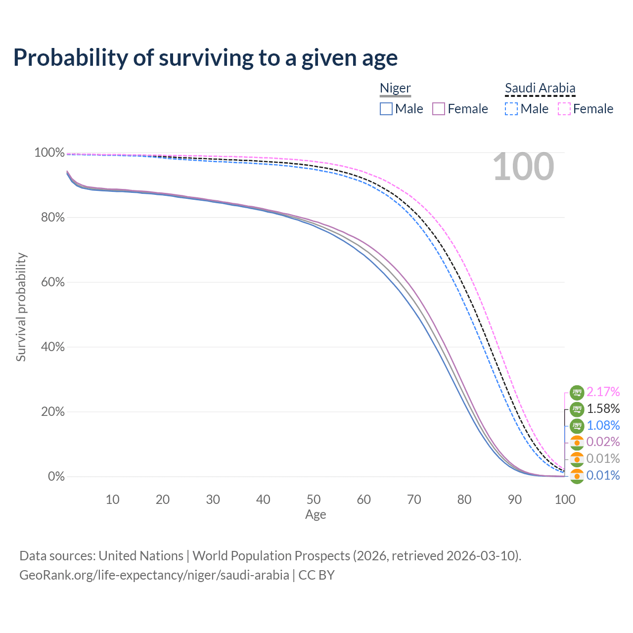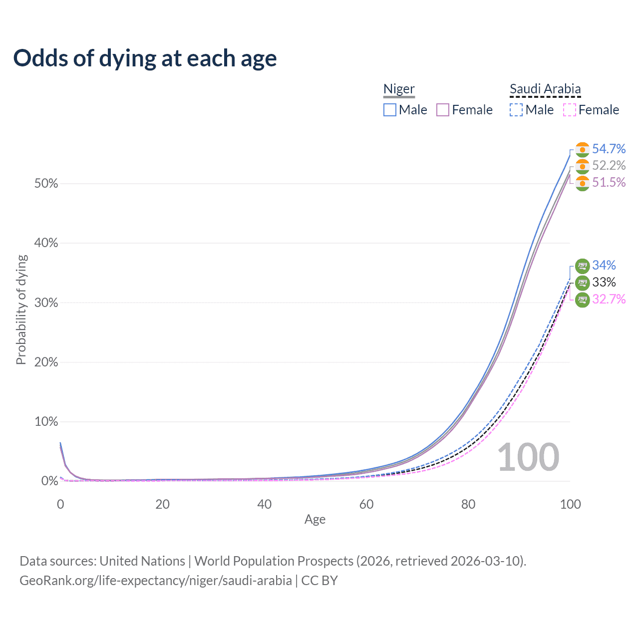 This life expectancy calculator shows the odds of living to 100, 95, 90, and below based on current age for both males and females in Niger and Saudi Arabia, along with mean and median age of death. The calculations are based on the 2026 life tables (actuarial tables) from the UN World Population Prospects.