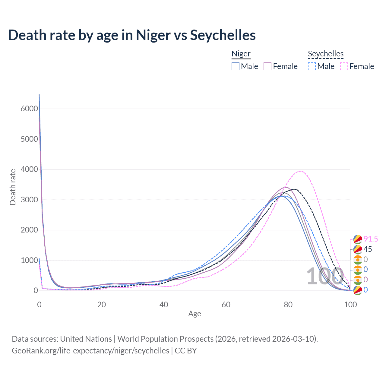In Niger, the most common age of death is 0, compared to 82 in the Seychelles. The median age of death is 71.7 in Niger and 77 in the Seychelles, meaning only half of each cohort is expected to live past that age.