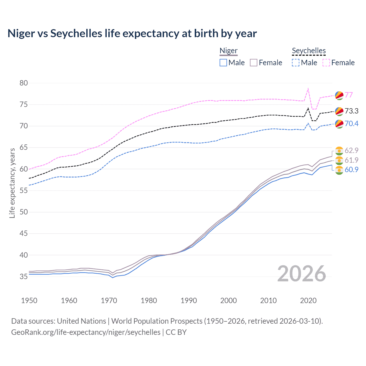 The average life expectancy at birth is 61.9 years in Niger vs 73.3 in the Seychelles. Niger is ranked 187/197 by life expectancy, and the Seychelles is 111/197. In Niger, the life expectancy is 60.9 years for males and 62.9 years for females. In the Seychelles, it's 70.4 years for males and 77 years for females.
