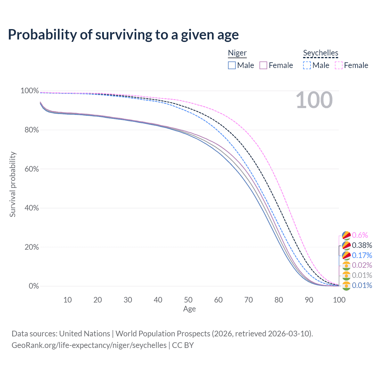 This life expectancy calculator shows the odds of living to 100, 95, 90, and below based on current age for both males and females in Niger and the Seychelles, along with mean and median age of death. The calculations are based on the 2026 life tables (actuarial tables) from the UN World Population Prospects.