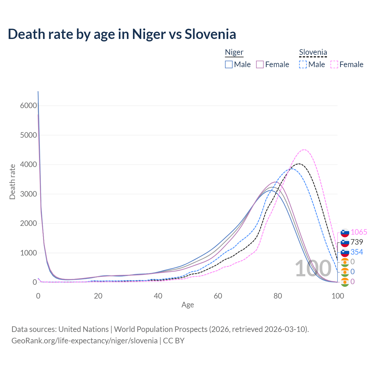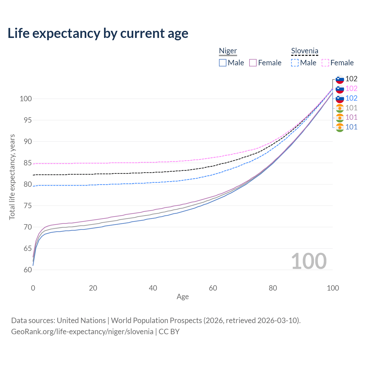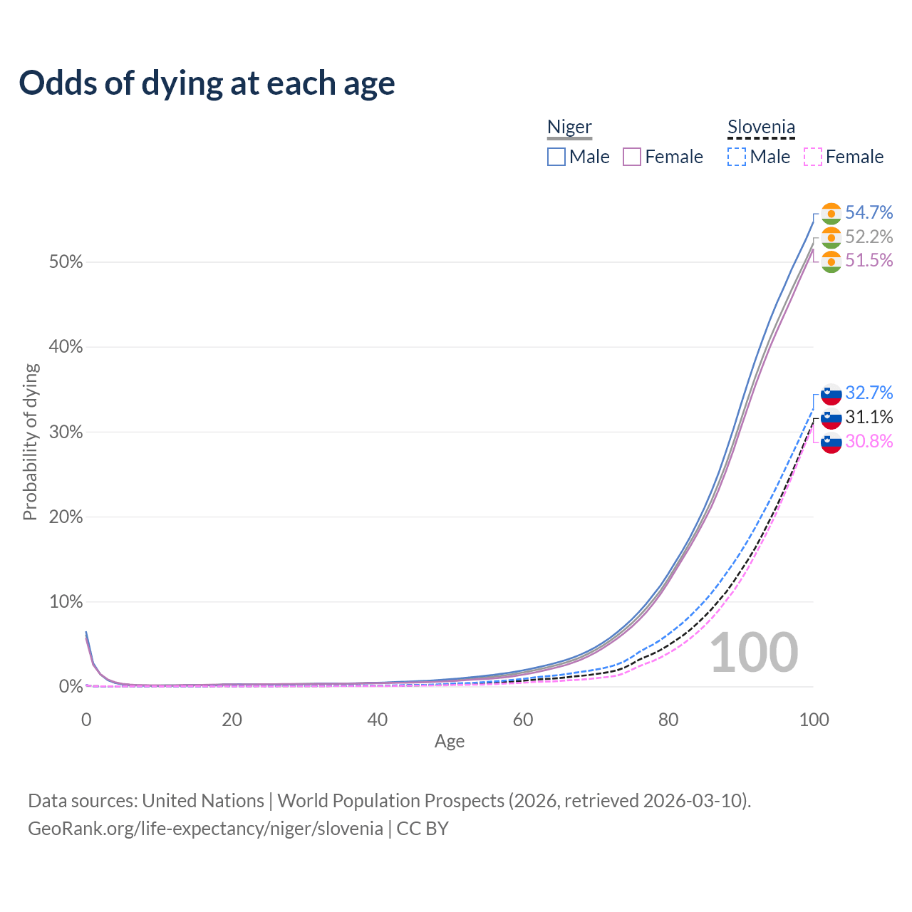 This life expectancy calculator shows the odds of living to 100, 95, 90, and below based on current age for both males and females in Niger and Slovenia, along with mean and median age of death. The calculations are based on the 2026 life tables (actuarial tables) from the UN World Population Prospects.
