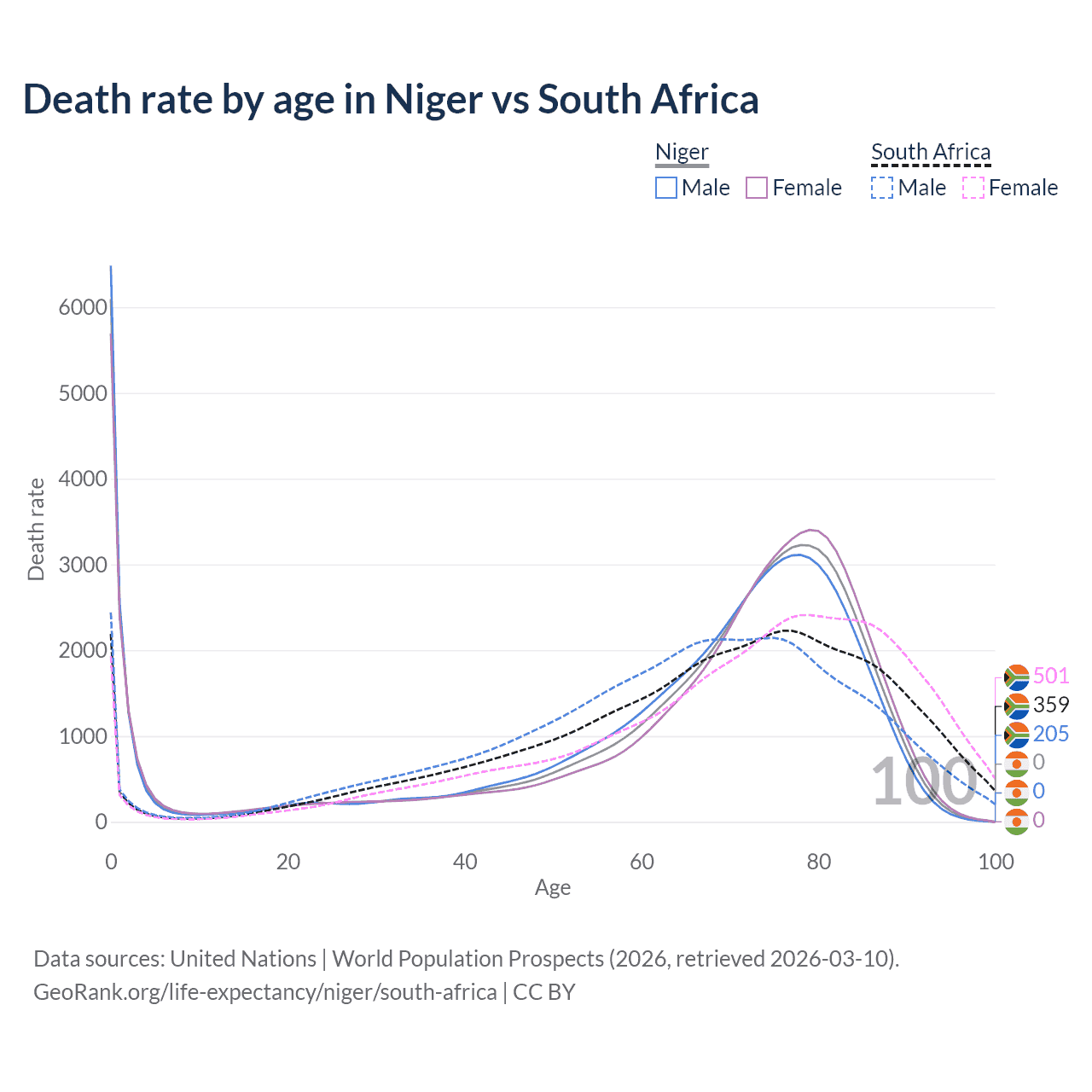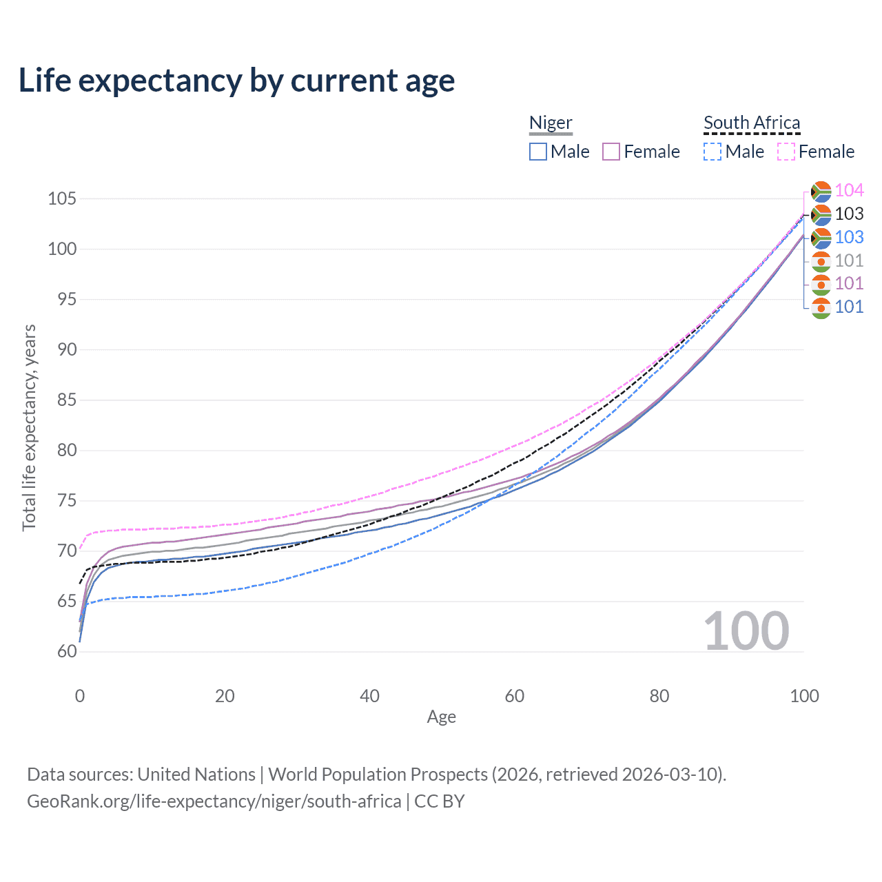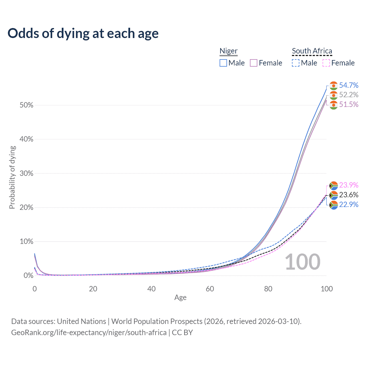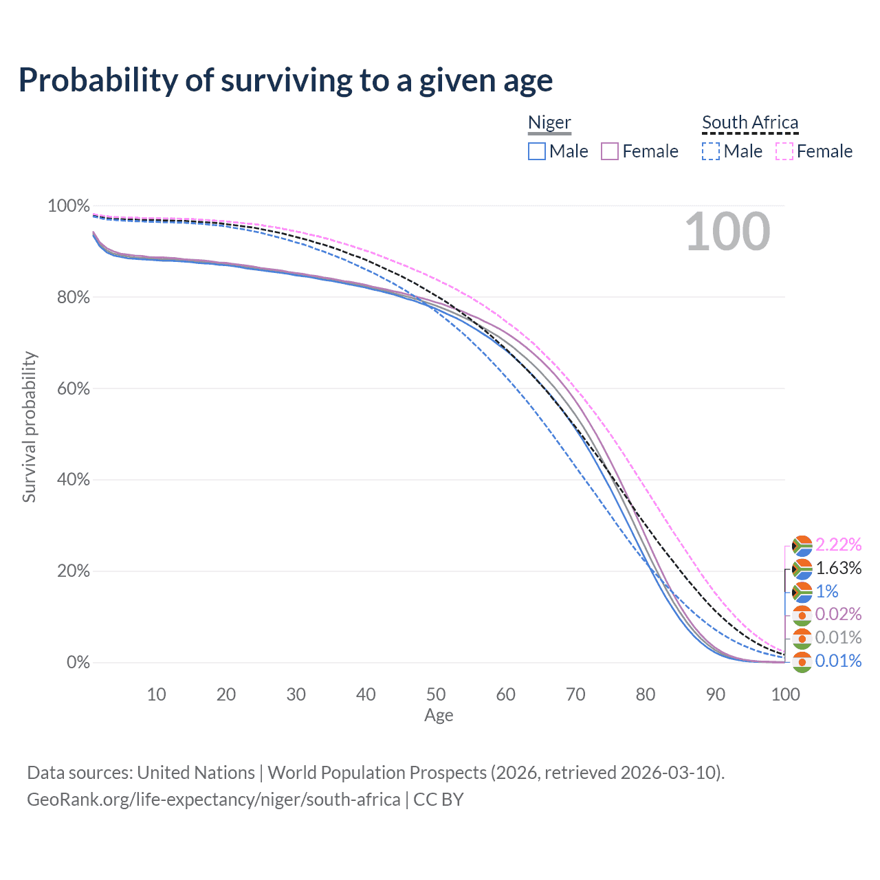 This life expectancy calculator shows the odds of living to 100, 95, 90, and below based on current age for both males and females in Niger and South Africa, along with mean and median age of death. The calculations are based on the 2026 life tables (actuarial tables) from the UN World Population Prospects.