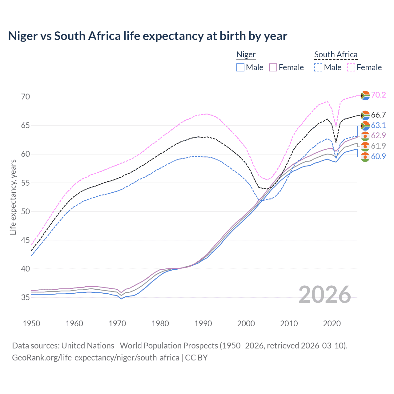 The average life expectancy at birth is 61.9 years in Niger vs 66.7 in South Africa. Niger is ranked 187/197 by life expectancy, and South Africa is 164/197. In Niger, the life expectancy is 60.9 years for males and 62.9 years for females. In South Africa, it's 63.1 years for males and 70.2 years for females.