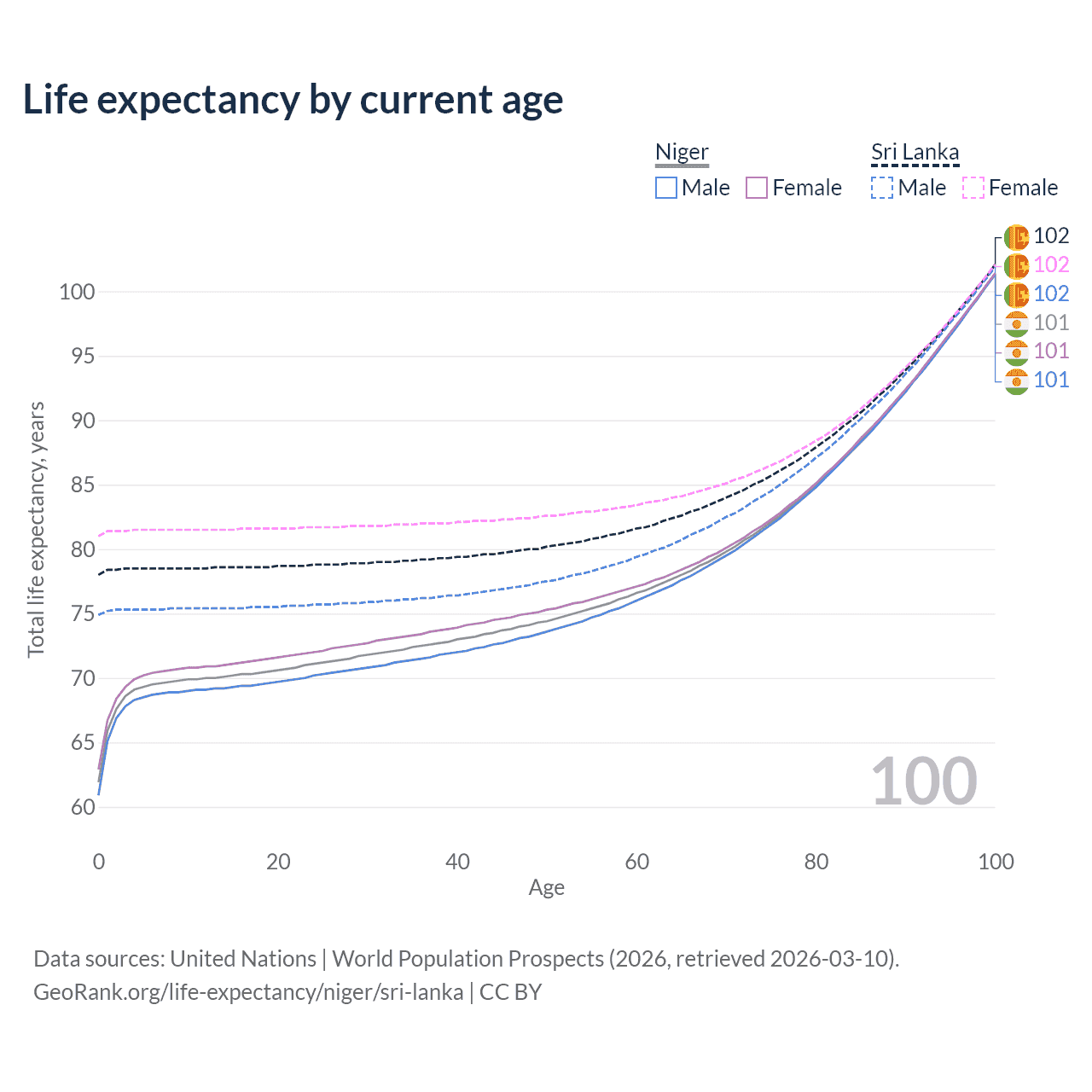 This life expectancy calculator shows the odds of living to 100, 95, 90, and below based on current age for both males and females in Niger and Sri Lanka, along with mean and median age of death. The calculations are based on the 2026 life tables (actuarial tables) from the UN World Population Prospects.